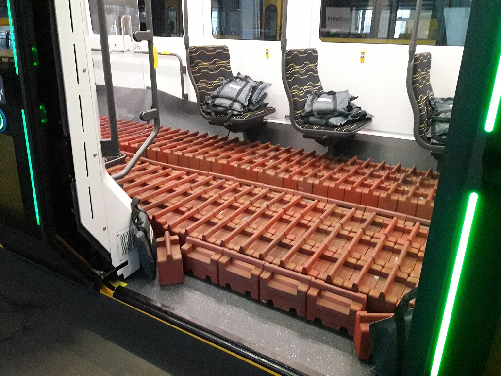 Rund fünf Stunden lang mussten knapp 1700 Gewichte meist händisch in das Fahrzeug geladen werden. Mit weiteren Betriebsstoffen, Mess- und Schutzausrüstung und dem technischen Personal bringt die Stadtbahn nun in Summe 85,5 Tonnen auf die Waage. Diese hohe Last muss die Bahn nur für die Tests aushalten. Damit sollen beispielsweise Bremsproben durchgeführt oder die Durchbiegung des Wagens unter enormen Druck gemessen werden. Später im normalen Fahrbetrieb wird diese Last selbst bei Höchstbelegung von 290 Passagieren nicht einmal annähernd erreicht, heißt es von den DVB.