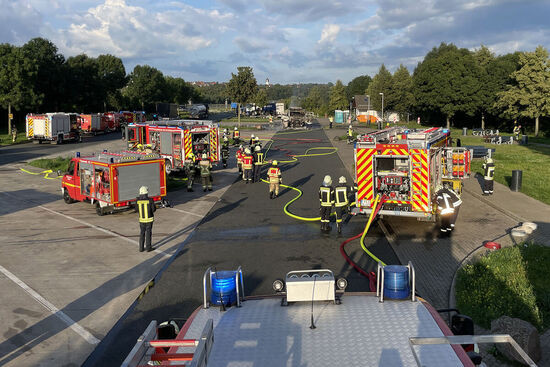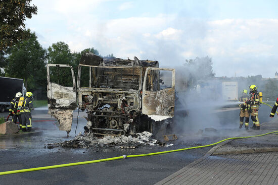 Als die Feuerwehr eintraf, stand der Anhänger mit den beiden nagelneuen LKW MAN lichterloh in Flammen. Mit zwei Strahlrohren konnten die Feuerwehrleute den Brand löschen. Trotz des schnellen Einsatzes war der Anhänger mitsamt teurer Fracht nicht mehr zu retten: Die LKW brannten komplett aus. Der Parkplatz war während der Löscharbeiten gesperrt. Die Polizei schätzt den entstandenen Sachschaden auf ca. 270.000 Euro. Als Ursache wird ein technischer Defekt in Betracht gezogen.
