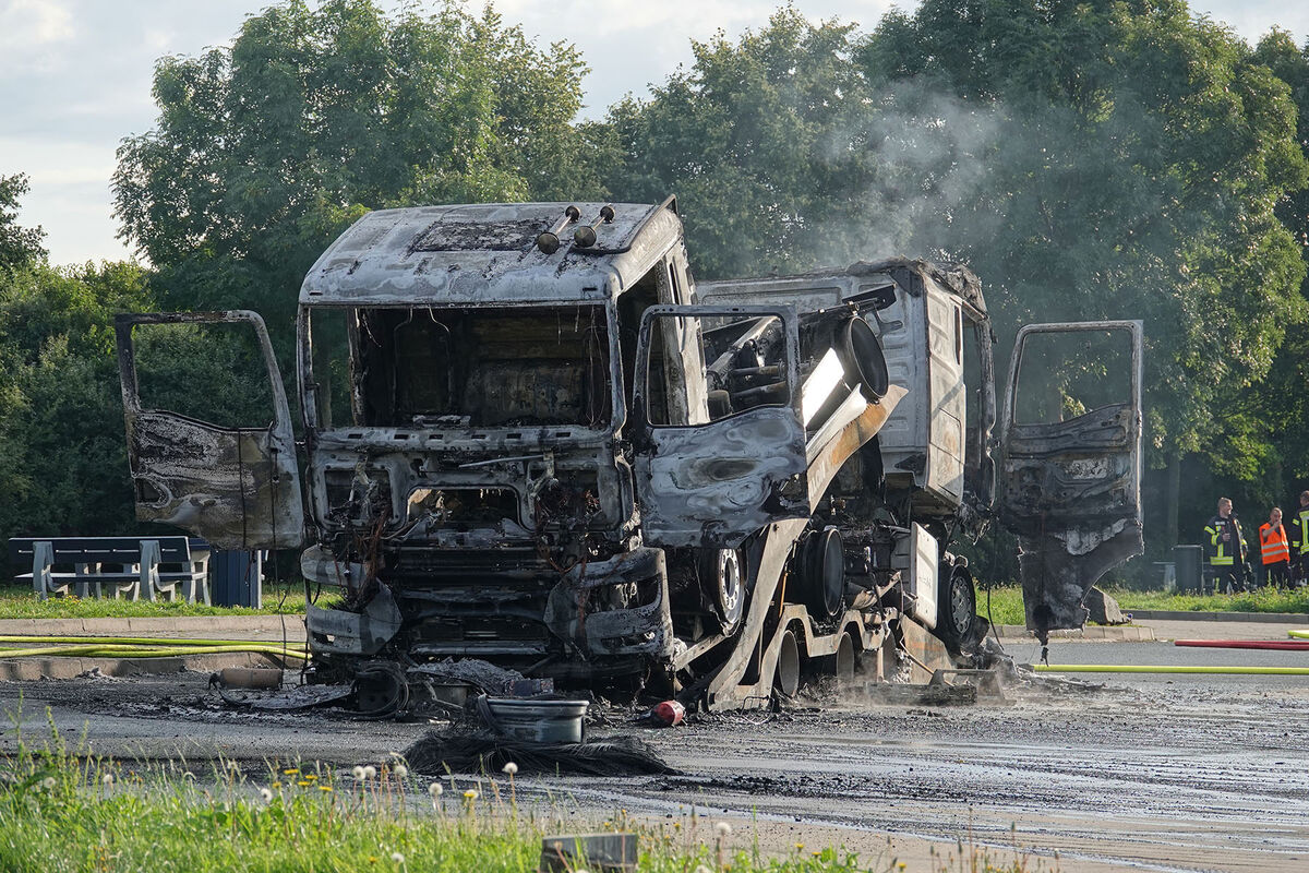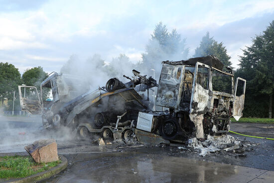 - Totalschaden: Der ausgebrannte Anhänger mitsamt den beiden geladenen LKW.