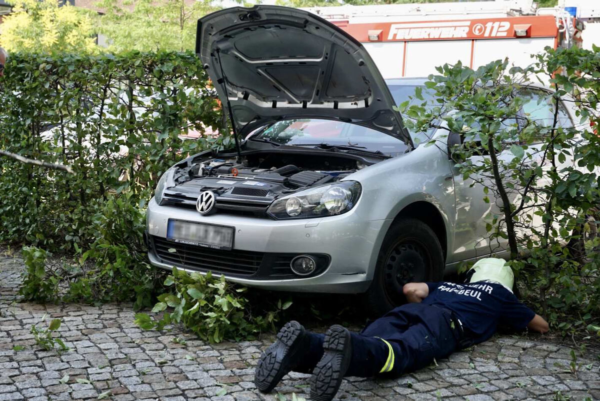 - Die Feuerwehr beweist vollen Körpereinsatz, um den Wagen zu befreien.