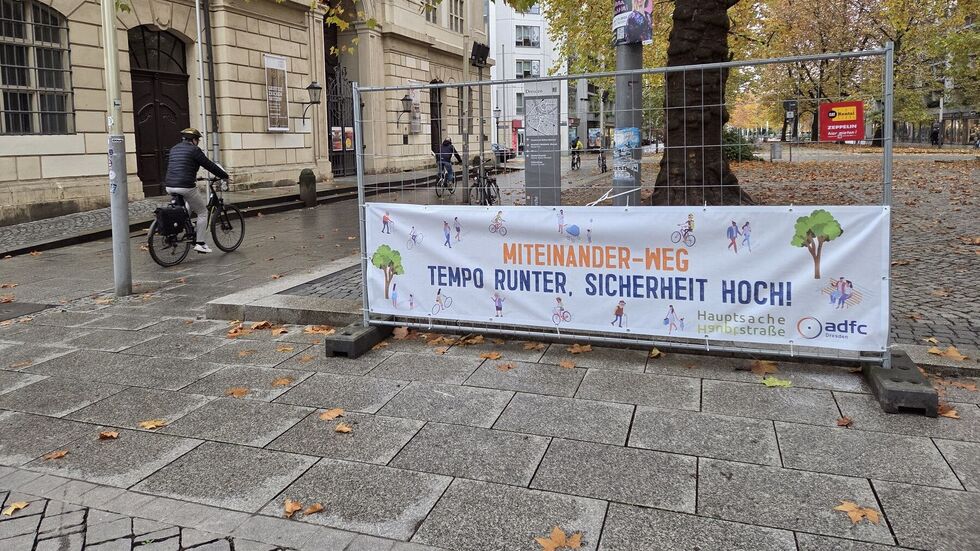 Mit einem Plakat mahnt der ADFC Dresden alle Radfahrer auf der Hauptstraße zu Rücksicht und einem gefahrlosen Miteinander. Gleichzeitig unterbreitet der Fahrradclub Vorschläge zur Verbesserung der sogenannten Augustus-Route.