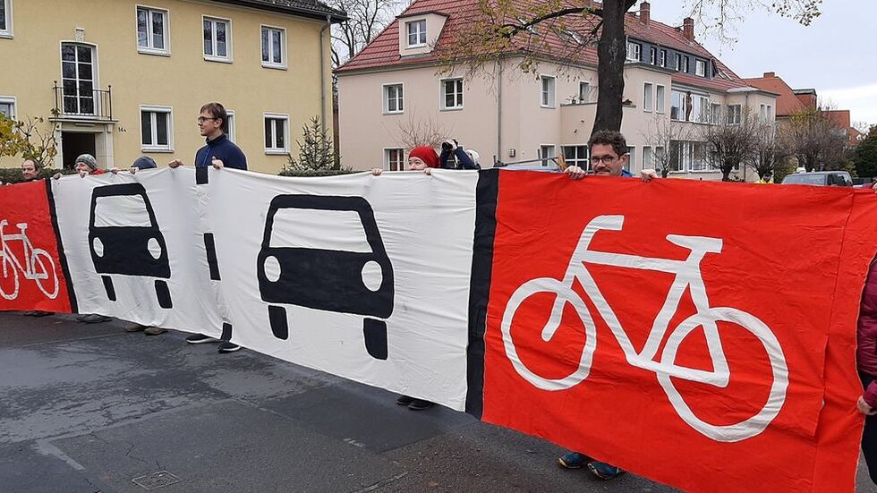 Der Fahrradclub ADFC kritisiert die Pläne. Bei einer Demo vor Ort machte er mit großen Bannern auf die künftige Fahrbahnbreite aufmerksam und forderte einen Radweg für die Gostritzer Straße. Deren Ausbau ist für 2024 vorgesehen.