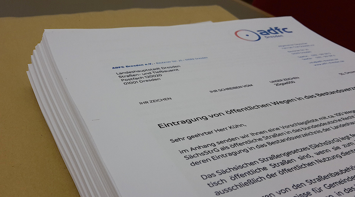 Der ADFC hat an die Stadtverwaltung einen Brief geschrieben, der 227 seitenlang ist. Das teilte der ADFC mit. Darin stehen öffentlich genutzte Wege für den Fuß- und Radverkehr, die noch nicht im Straßenbestandsverzeichnis stehen. Wie das Sächsische Straßengesetz vorschreibt, müssen bis Ende 2022 Wege und Verbindungen in das Verzeichnis nachgetragen werden, um sie für die Allgemeinheit zu sichern.
