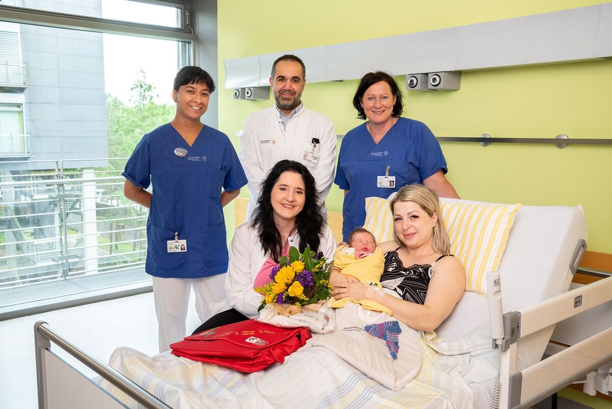 - Adrian ist das 1.000 Baby am Uniklinikum in diesem Jahr. Mama Irina geht es nach dem Kaiserschnitt gut. Auch Prof. Pauline Wimberger, Direktorin der Frauenklinik (vorn l.), Hebamme Vivien, Cahit Birdir, leitender Oberarzt der Geburtshilfe, sowie die leitende Hebamme Sandra Rings (hinten v.l.n.r) freuen sich über das Jubiläumsbaby.