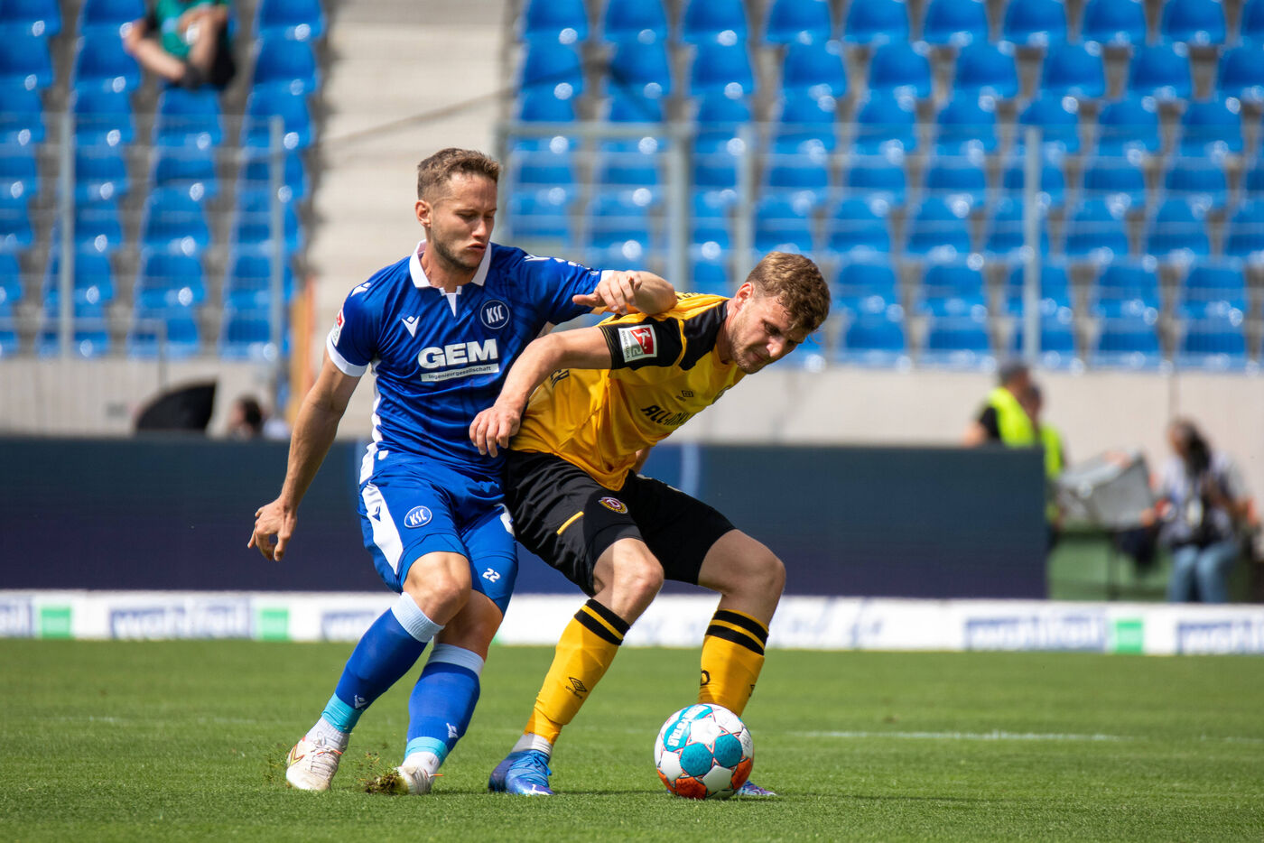 Dynamo bleibt seit 16 Zweitligaspielen sieglos. Die Schwarz-Gelben kamen beim Karlsruher SC am vorletzten Spieltag der 2. Bundesliga zu einem 2:2. Patrick Weihrauch brachte die SGD in der 26. Minute in Führung. Kapitän Jerôme Gondorf (65.) und Torjäger Philipp Hofmann (74.) drehten die Partie vor 18 649 Zuschauern zu Gunsten der Karlsruher. In der Nachspielzeit traf Dresdens Michael Akoto (90.+4) aber noch zum 2:2. Sportlich stand im Wildpark nicht viel auf dem Spiel. Der KSC hat den Ligaverbleib längst sicher. Auch dass Dynamo in die Abstiegsrelegation muss, stand schon vorab fest. In der Relegation trifft Dynamo auf den 1. FC Kaiserslautern. Die Pfälzer verloren bei Viktoria Köln mit 0:2 und stehen damit als Tabellendritter der 3. Liga fest.