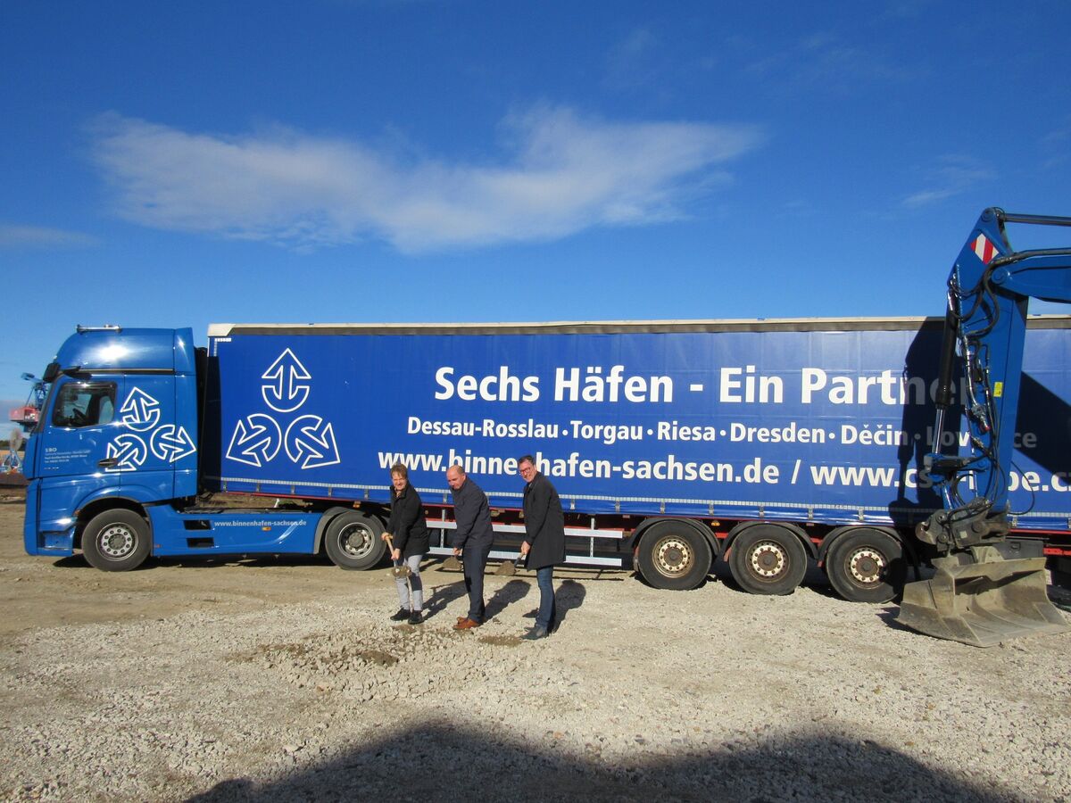 Der Dresdner Alberthafen investiert fünf Millionen Euro in einen neuen Umschlagplatz. Für den sogenannte TrailerPort war am Dienstag erster Spatenstich, er entsteht bis Juni 2024 auf der Südseite des Hafens.