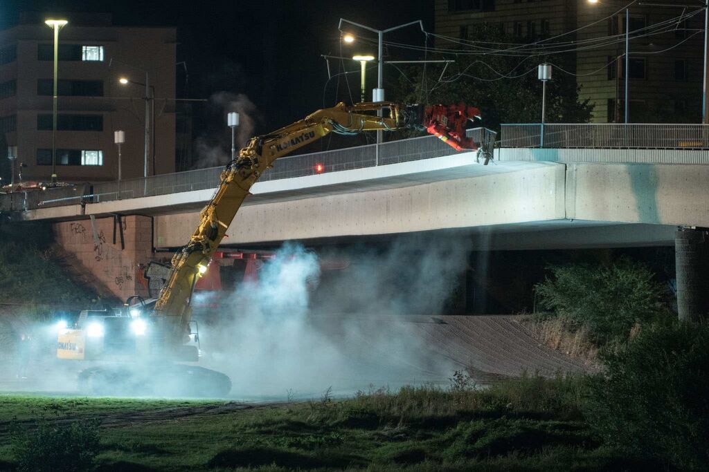 - Mit Hochdruck arbeiteten die Bagger am Abriss der Carolabrücke.