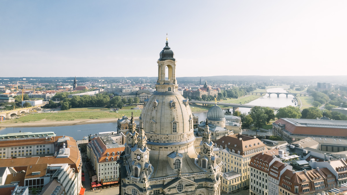 - Die Dresdner Frauenkirche mit der 67 Meter hohen Aussichtsplattform.
