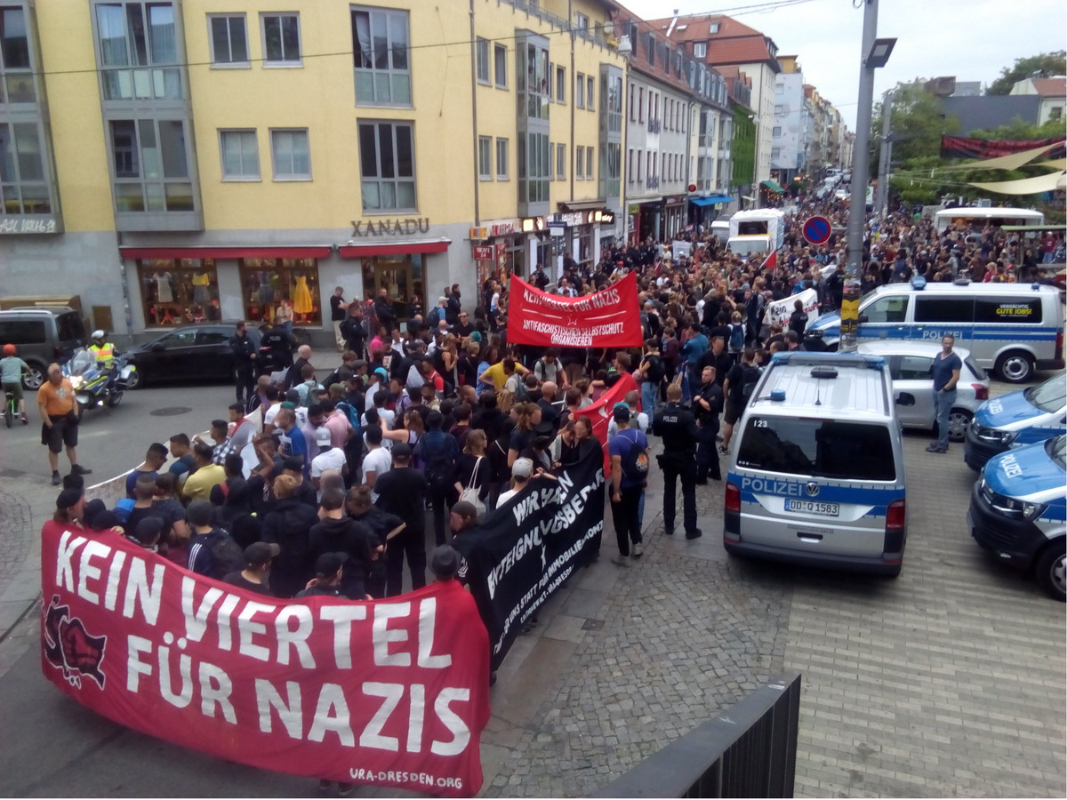 Mehr als 500 Teilnehmer sind am Freitagabend durch die Dresdner Neustadt gezogen. Die „Undogmatische Radikale Antifa“ hatte zu der Demonstration unter dem Motto „Kein Viertel für Nazis“ aufgerufen.
