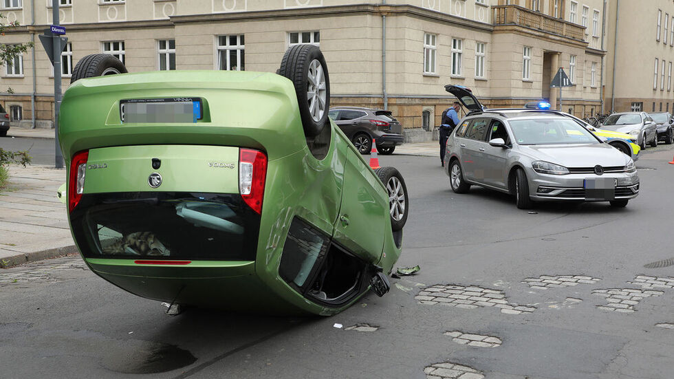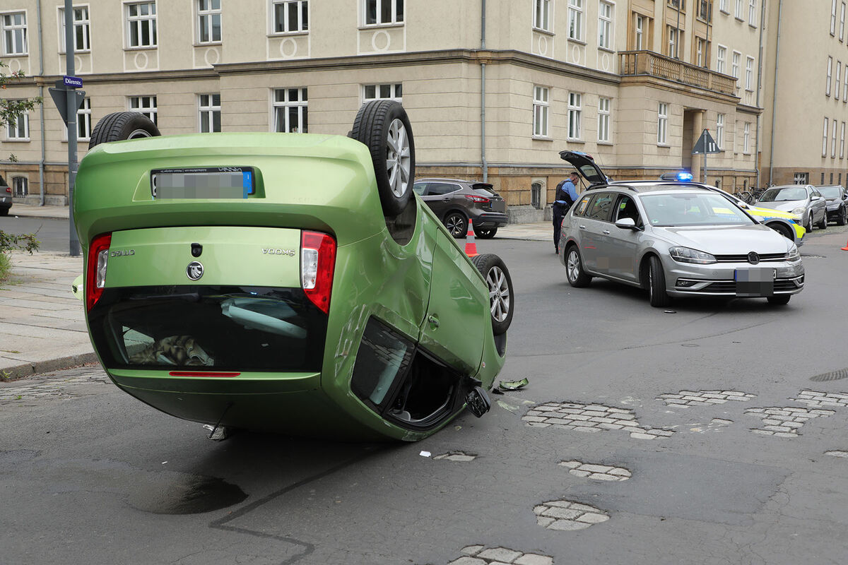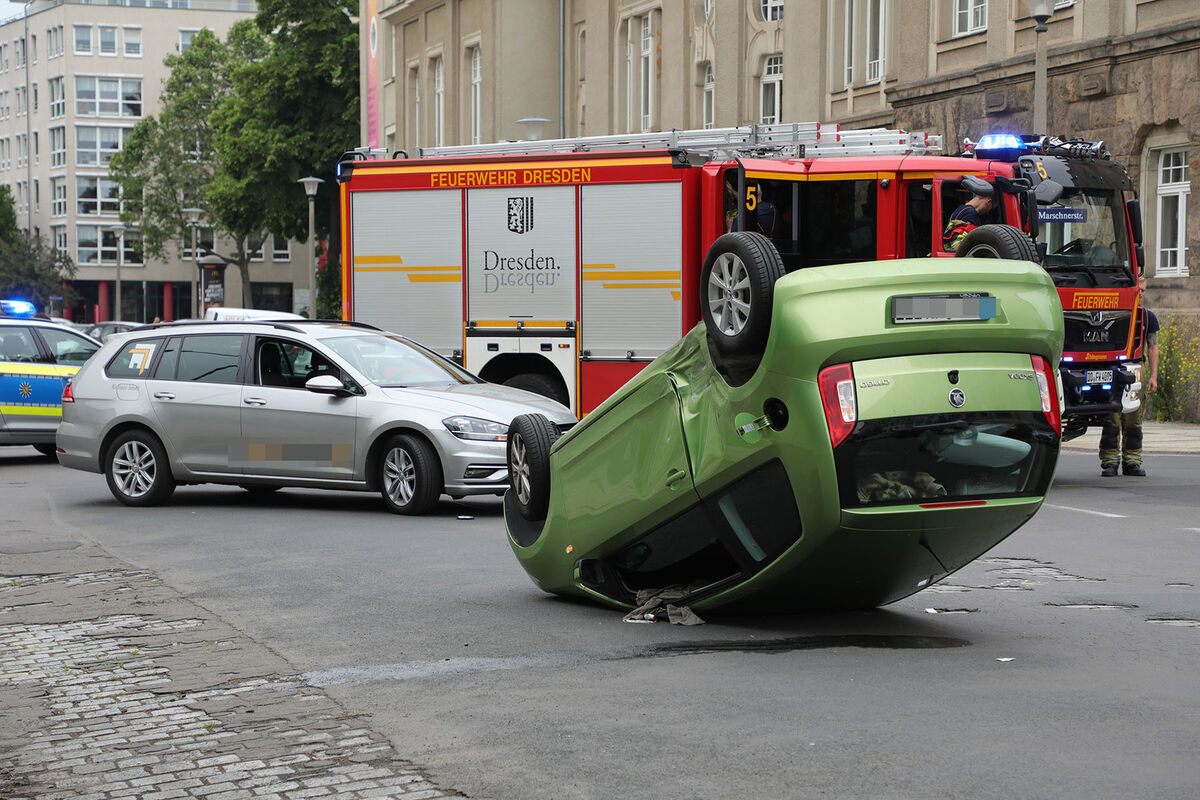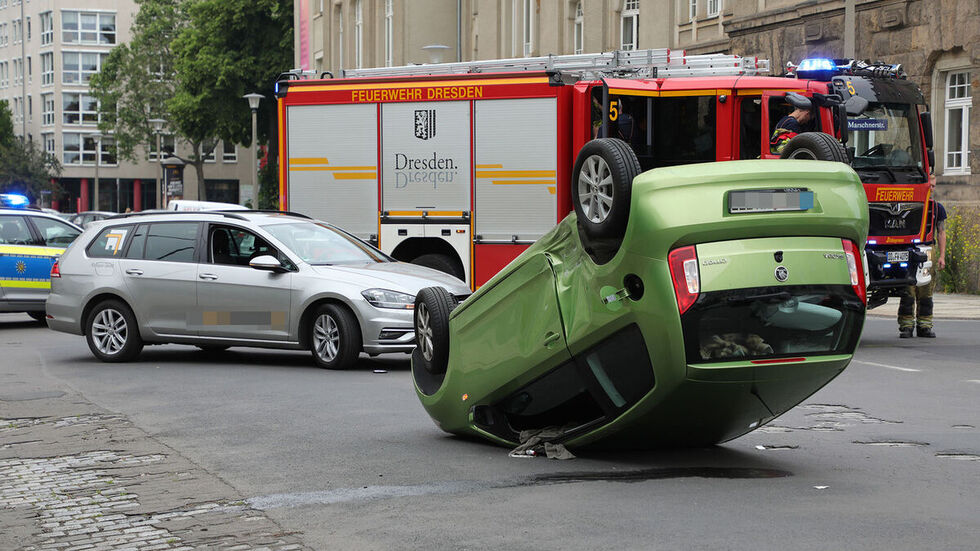 Auf der Dürerstraße in der Dresdner Johannstadt ist am Mittwochnachmittag ein Auto nach einem Unfall auf dem Dach gelandet. Ein Skoda und ein VW waren aus noch ungeklärter Ursache an der Kreuzung zur Marschnerstraße zusammengestoßen. In der Folge überschlug sich der Skoda. Die 25 Jahre alte Fahrerin konnte sich nach Angaben der Feuerwehr selbst befreien.
