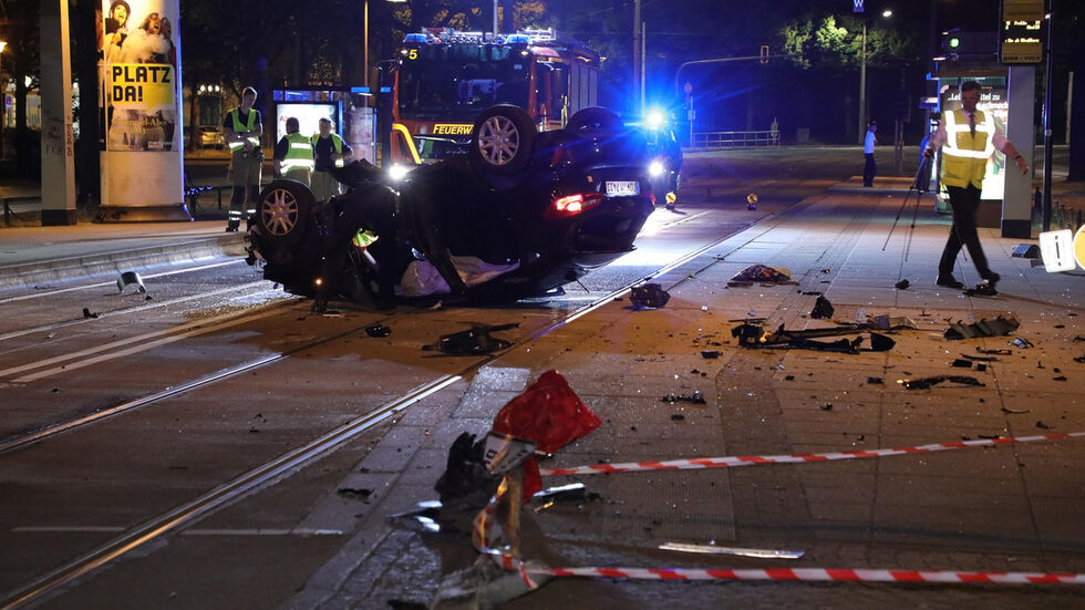 Am Sachsenplatz in Dresden hat es in der Nacht zu Sonntag einen schweren Verkehrsunfall gegeben. Ein Auto war kurz nach 2 Uhr von der Albertbrücke kommend auf den Gleisen der Straßenbahn weitergefahren. Dort prallte er gegen ein Verkehrsschild und eine Ampel, überschlug sich und blieb in der Straßenbahnhaltestelle auf dem Dach liegen.