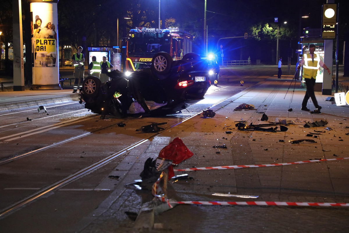 Am Sachsenplatz in Dresden hat es in der Nacht zu Sonntag einen schweren Verkehrsunfall gegeben. Ein Auto war kurz nach 2 Uhr von der Albertbrücke kommend auf den Gleisen der Straßenbahn weitergefahren. Dort prallte er gegen ein Verkehrsschild und eine Ampel, überschlug sich und blieb in der Straßenbahnhaltestelle auf dem Dach liegen.