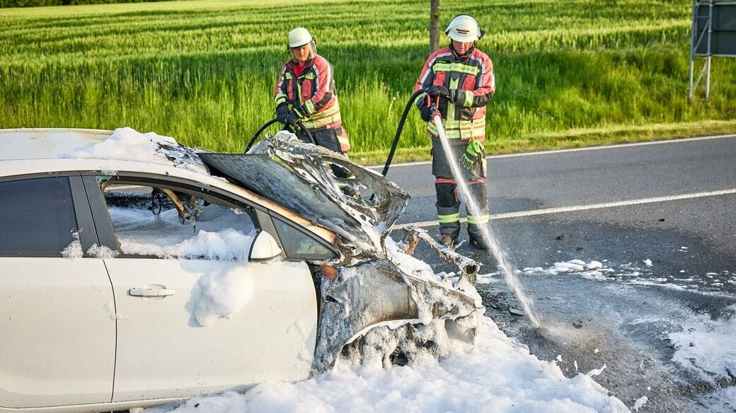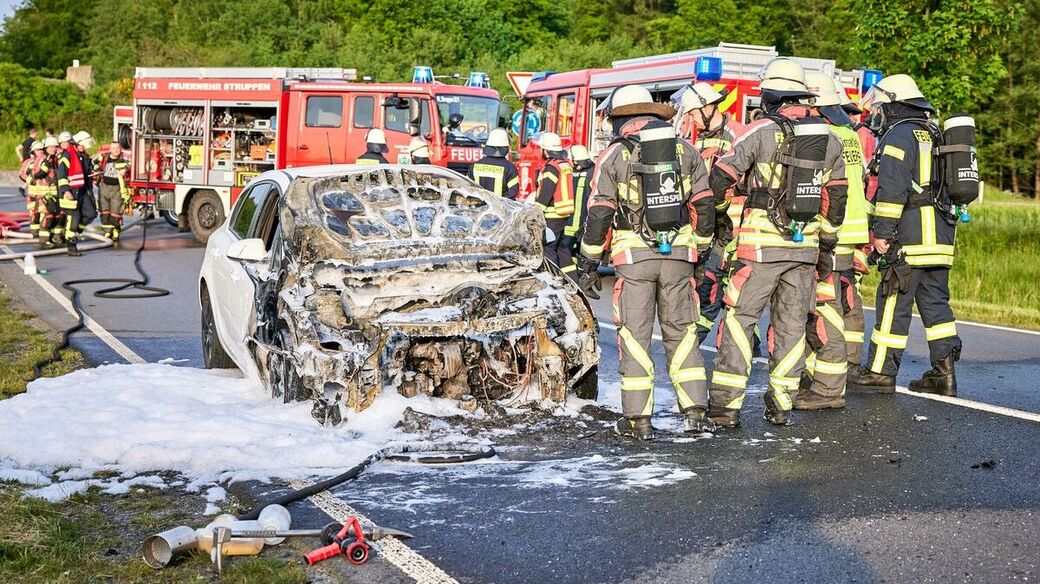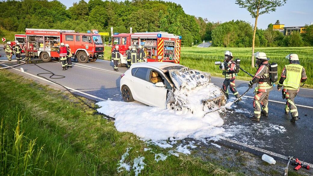Die Ursache des Feuers könnte ein technischer Defekt sein. Im Einsatz waren rund 43 Kameraden der Feuerwehr. An dem Wagen entstand wohl Totalschaden.