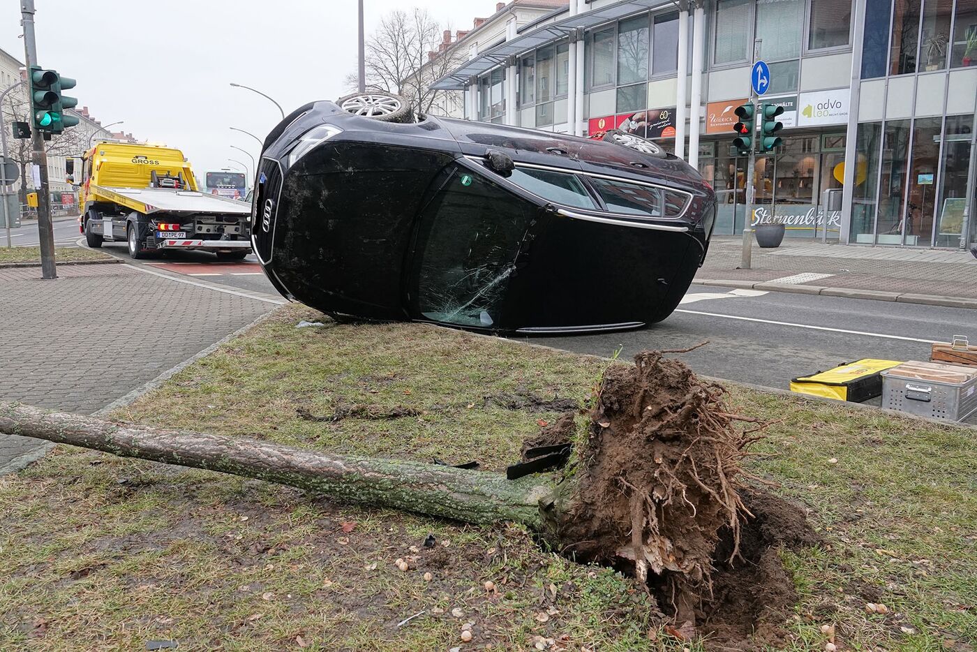 Am „Nürnberger Ei“ in Dresden ist am Freitag ein Auto ins Schleudern geraten und umgekippt. Der Audi fuhr aus noch ungeklärter Ursache auf die Mittelinsel und fällte dort ein kleines Bäumchen, dann legte es ihn auf die Seite.
