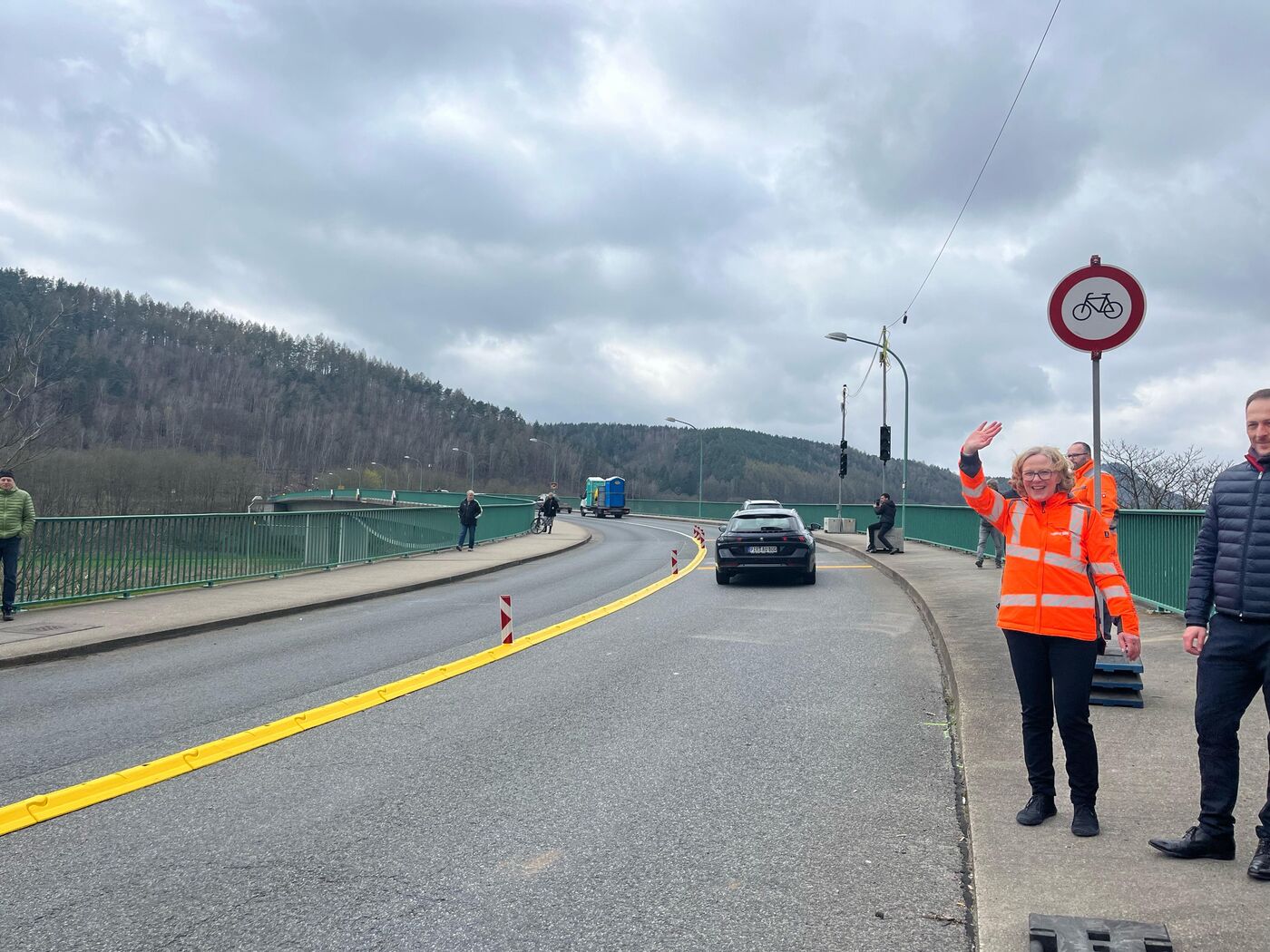 - Ministerin Regina Kraushaar winkt den ersten Autofahrern hinterher, die ab heute wieder die Elbbrücke in Bad Schandau befahren dürfen