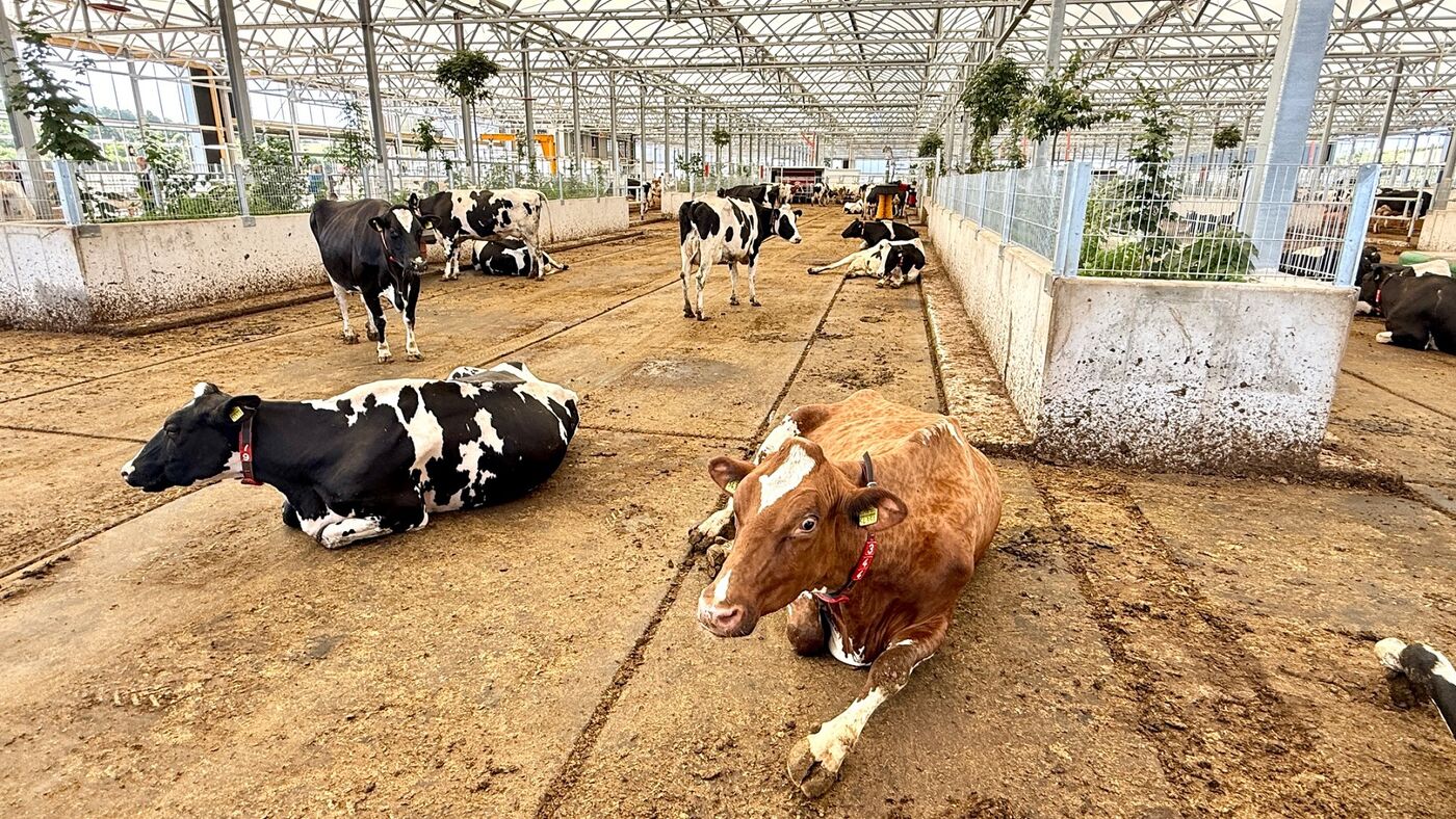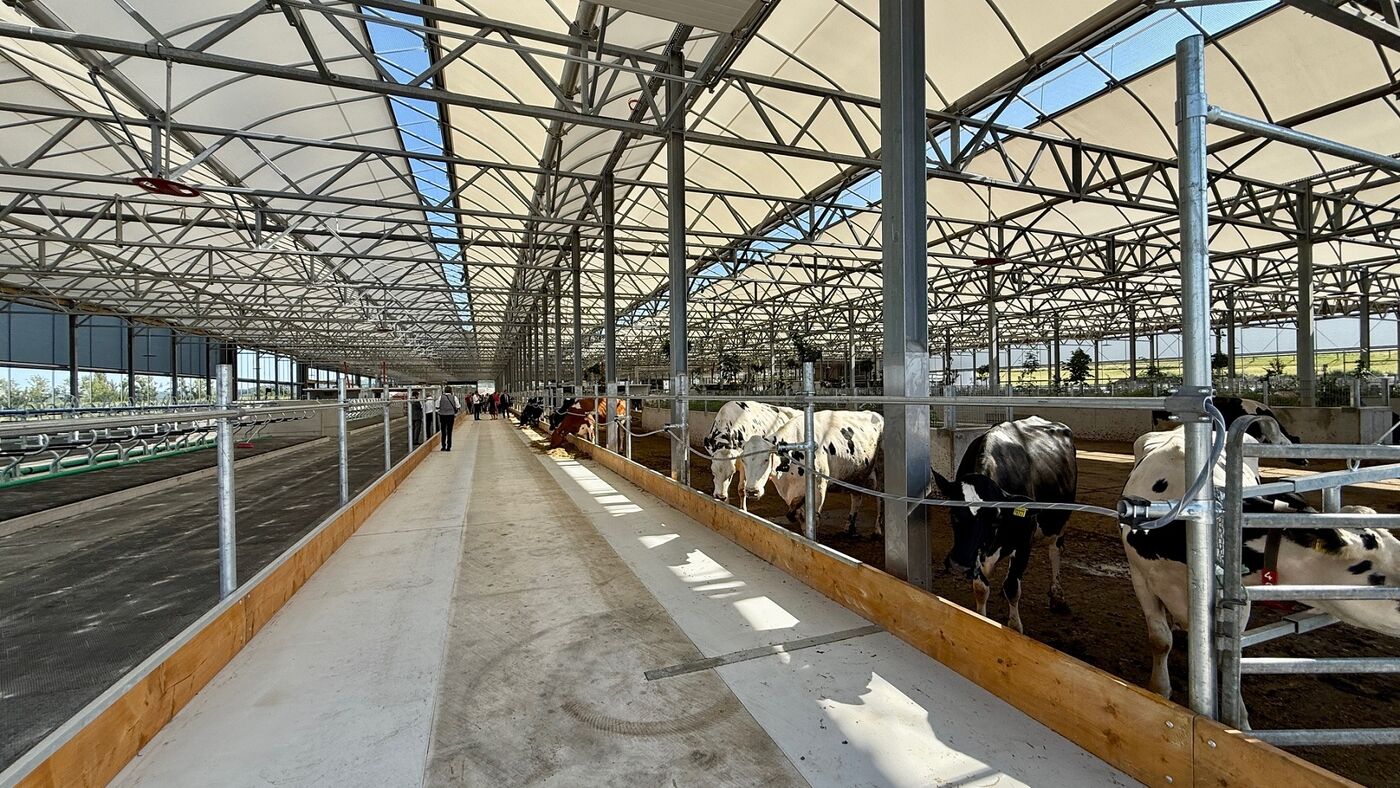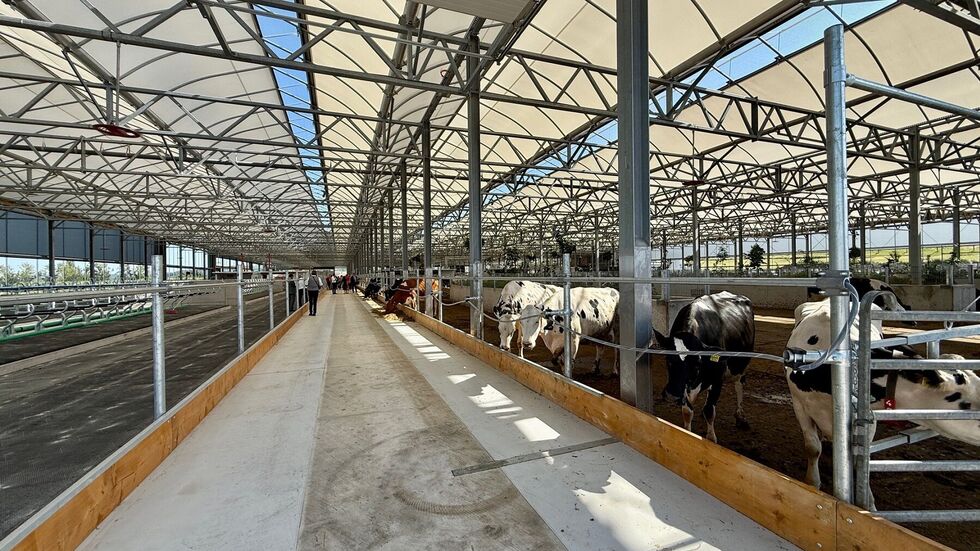 Es gibt einen großzügigen Auslauf mit bepflanzten Inseln, komfortable Liegeflächen und ein gesundes Stallklima. Der etwa 10.000 Quadratmeter große sogenannte Serrestall hat eine spezielle Dachkonstruktion und ist an den Seiten offen. So gelangen Tageslicht und Frischluft in den Stall, Hitzestress wird reduziert. Die Kühe liegen und laufen im Freilaufbereich auf einem „High Wellfare Floor“, einem Boden, der weich und feuchtigkeitsdurchlässig ist. Urin und Kot werden sofort getrennt, damit werden die Ammoniak-Emissionen verringert.
