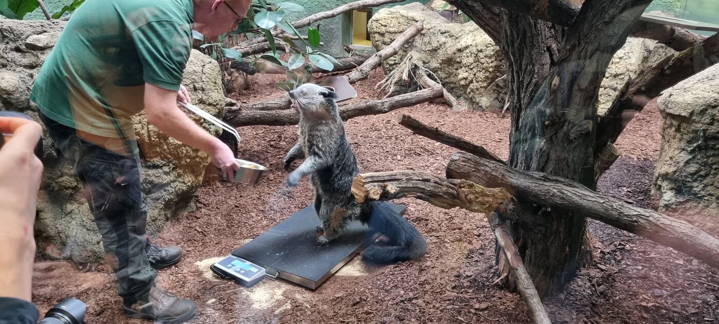 - das Binturong-Weibchen Svantje wird gewogen