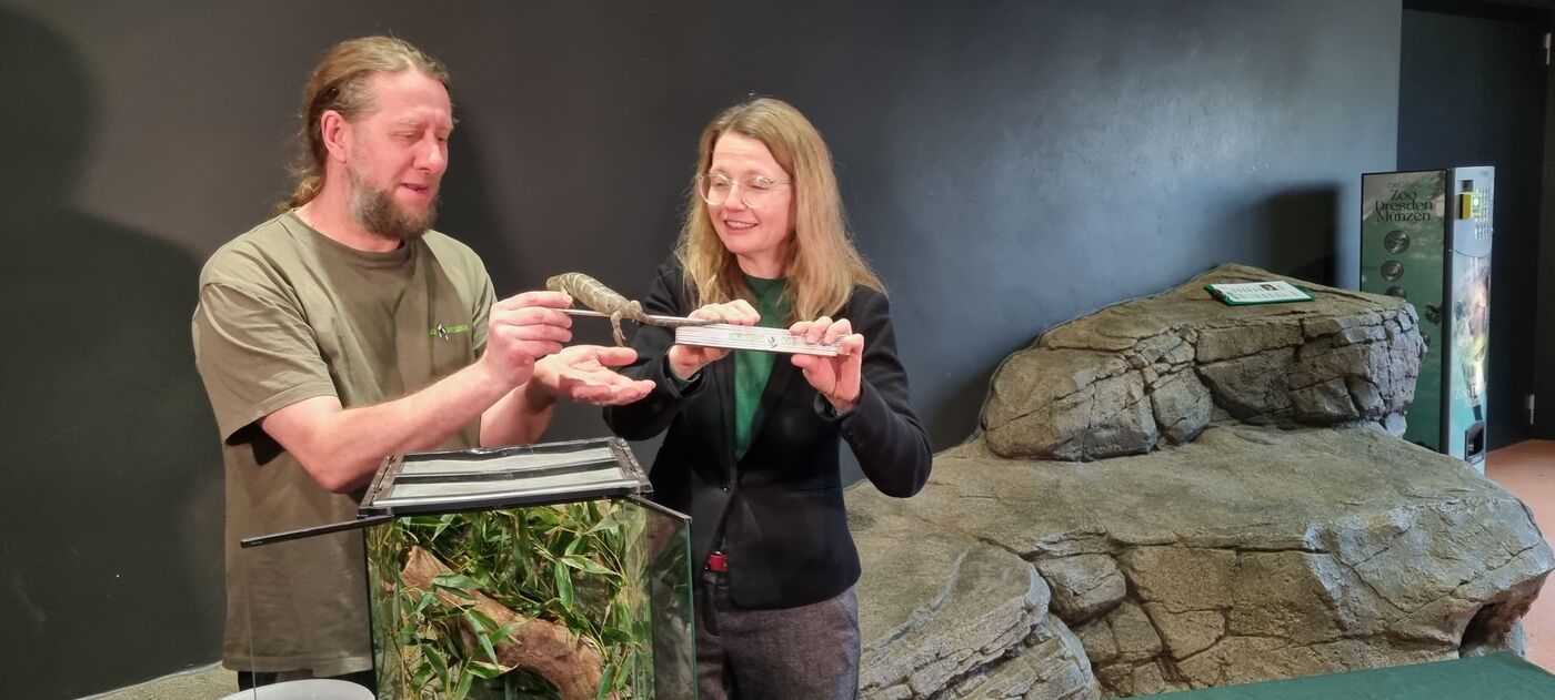 Messen, wiegen, zählen: Im Zoo Dresden sind zum Jahresbeginn alle Tiere genau unter die Lupe genommen worden. Kulturbürgermeisterin Annekatrin Kleppsch hat auch fleißig mitgeholfen und ganz routiniert mal eben eine seltene, kleine Echse, den Wickelschwanzskink gemessen: „28 cm bringt der Kleine mit. Ich hab ein ruhiges Händchen für sowas. Zu Hause füttere ich immer unsere beiden Kaninchen.“ Nach langem Anlocken mit allerlei Obst, hat's dann auch das scheue Binturong-Weibchen Svantje auf die Waage geschafft. Die große Schleichkatze bringt knapp 15 Kilo auf die Waage. Alle Tiere sind also wohl auf im neuen Jahr. Und auch das letzte Jahr war tierisch gut, findet Zoodirektor Karl-Heinz Ukena: „Das im Jahr 2024 eröffnete Orang-Utan Haus erfreut sich großer Beliebtheit. Die Orang-Utans haben sich prima eingelebt und auch die Zoo-Besucher finden es klasse.“ Knapp 500 000 Gäste besuchten 2024 die fedrigen und felligen Besucher am großen Garten.