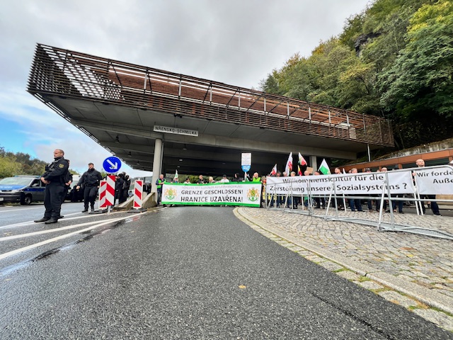 Demonstranten haben am Samstag den deutsch-tschechischen Grenzübergang Schmilka - Hrensko auf der B172 mehrfach symbolisch geschlossen. Zwischen 10 und 17 Uhr blockierten sie jede Stunde einmal für 10 Minuten die Bundesstraße. Das war mit der Versammlungsbehörde so abgesprochen.