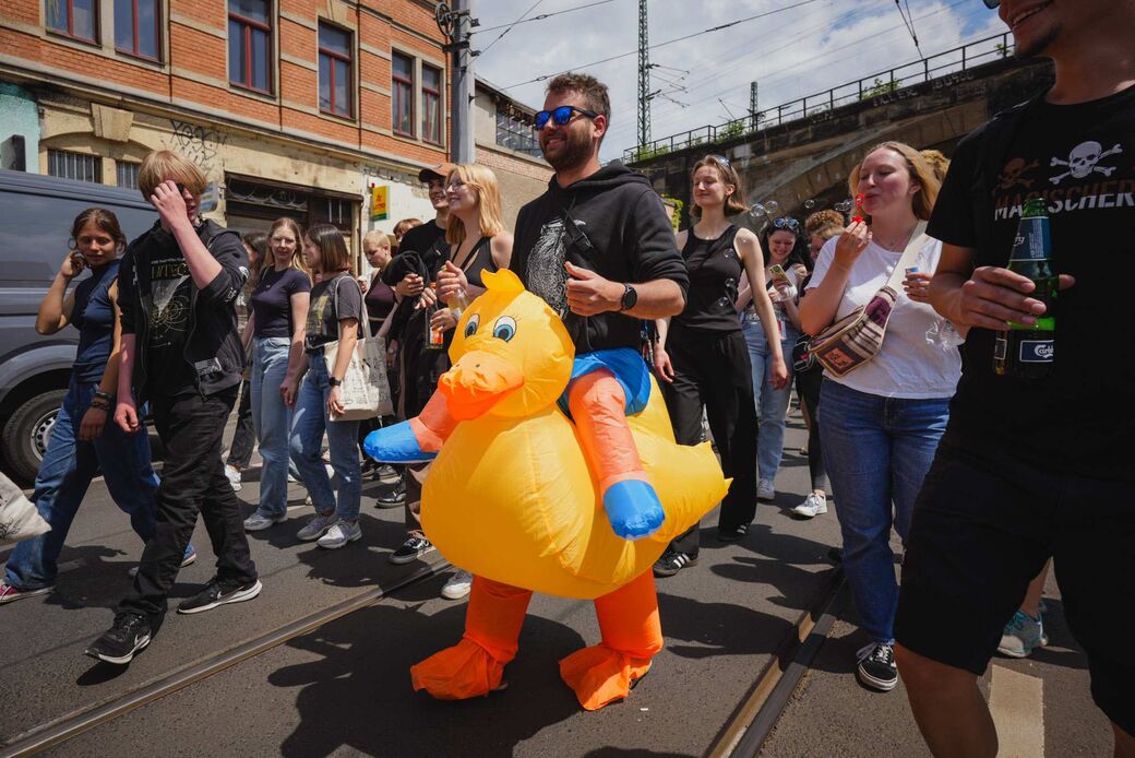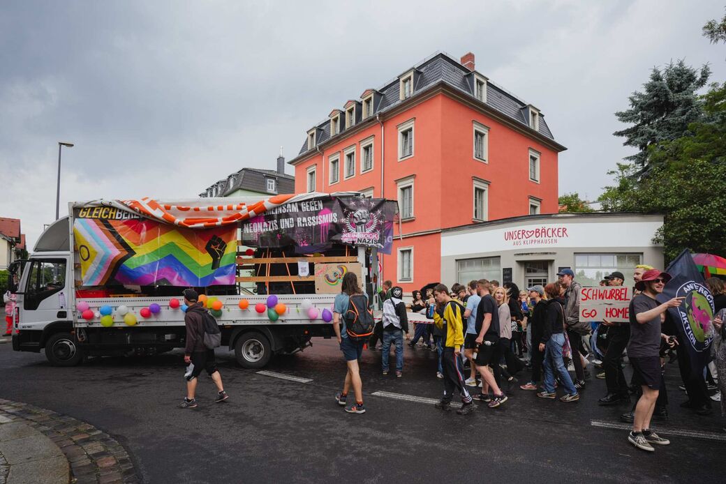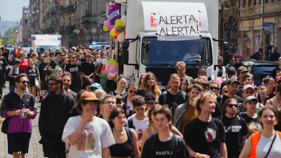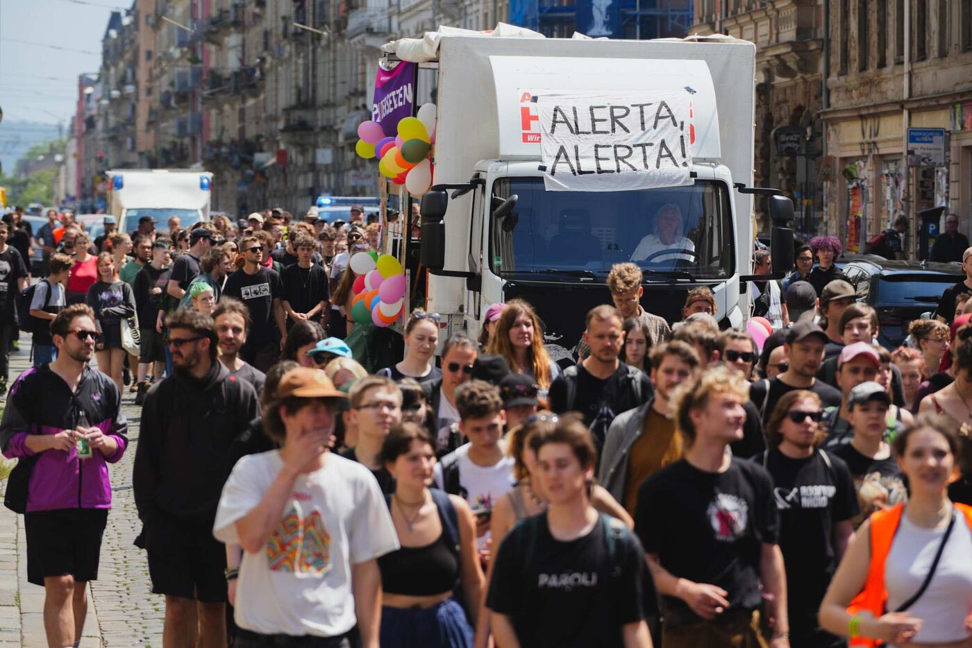 Doch vorher setzten schätzungsweise 400 junge Menschen ein Zeichen für Vielfalt, Offenheit und gegen Rechts. Mit Bezug auf das Sommerfest „Bunte Republik Neustadt“ stand die Tanz-Demo dabei unter dem Motto „Antifaschistische Republik Neustadt“. Die Demonstranten sammelten sich am Mittag im Alaunpark - im Herzen der Dresdner Neustadt. Von dort brachen sie zu ihrer sechsstündigen Demonstrationsroute auf.