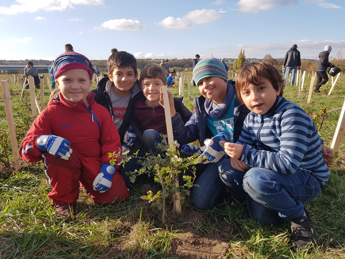 - Ella, Arda, Gustav, Luis und Adan von der 15. Grundschule in Dresden, haben schon viele Bäume und Sträucher eingepflanzt. (Foto: Redaktion/Franziska Meier)