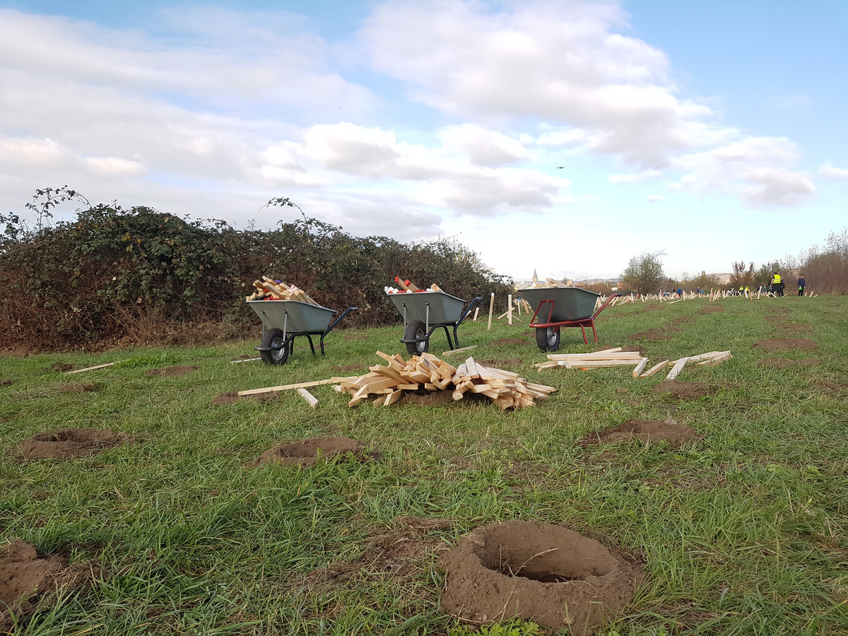 - Die farbigen Holzpfähle markieren, welcher Baum oder Strauch eingepflanzt werden soll. Etwa 14 verschiedene Sorten werden am Donnerstag in den Boden gebracht. (Foto: Redaktion/Franziska Meier)