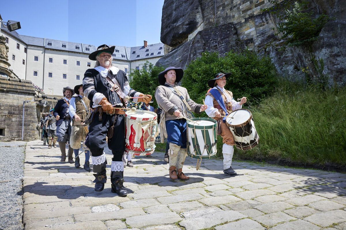 Ab heute (10. Juni) erobern die Schweden die Festung Königstein. Musketen knallen und Degen klirren: Mit aufwendigen Gefechtsdarstellungen soll ein lebendiger Eindruck von der Zeit des Dreißigjährigen Krieges dargestellt werden. Etwa 300 Laiendarsteller verschiedener Nationen kampieren dafür bis Sonntag auf der Bergfestung. Es ist einer der jährlichen Höhepunkte im Veranstaltungskalender des Museums.