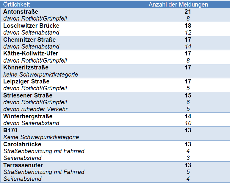 Polizei und Stadtverwaltung haben dazu eine Bürgerbeteiligungs-Plattform gestartet. Am häufigsten wurde dabei die Ampelkreuzung am Bahnhof Neustadt genannt, dort gibt es am Grünpfeil immer wieder große Gefahr für Radfahrer. Das Blaue Wunder landete auf Platz 2, ein gefahrloses Überholen von Radfahrern ist dort nicht möglich. Auf der Chemnitzer Straße ist der "Schutzstreifen" und die Straße selbst eng. Dort gibt es immer wieder gefährliche Situationen zwischen Radfahrern und Autos. Ab kommender Woche sollen ausgewählte Punkte verstärkt kontrolliert werden.