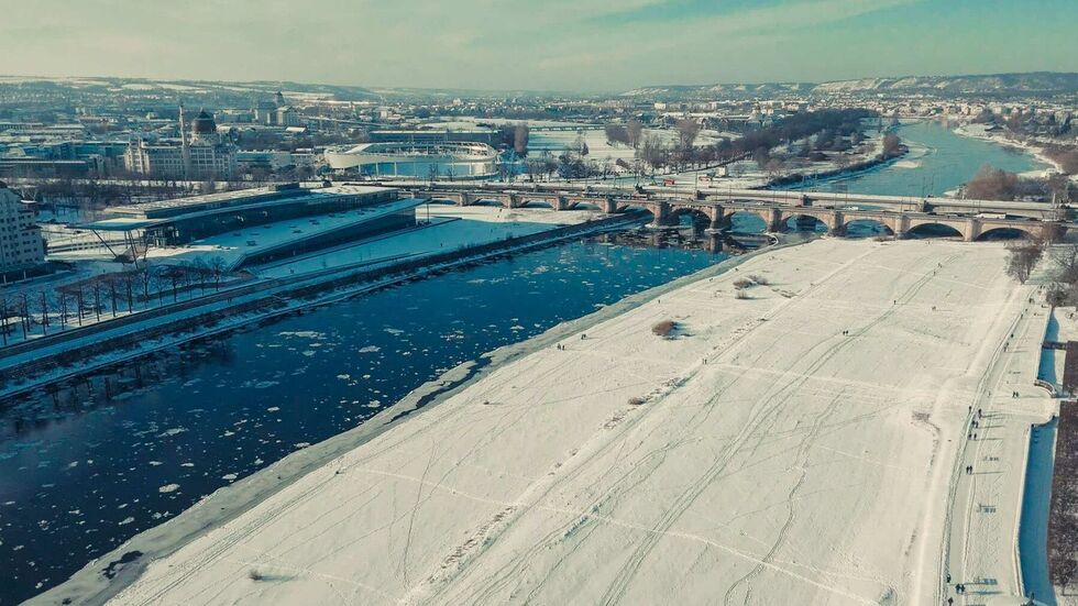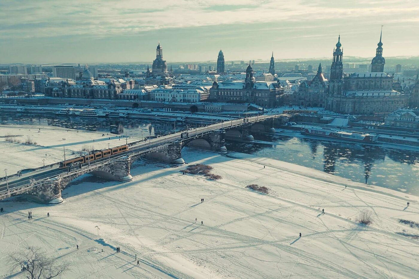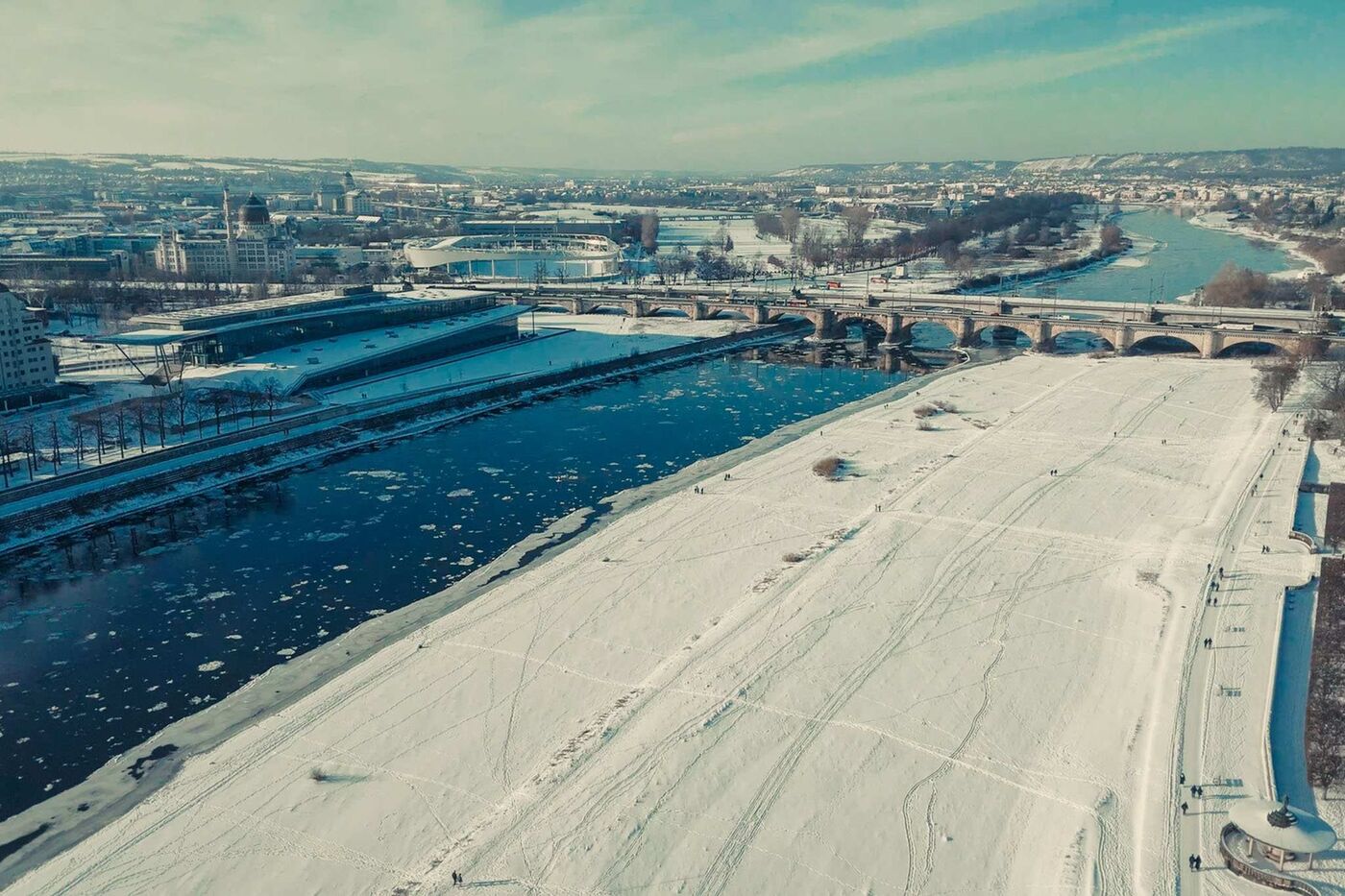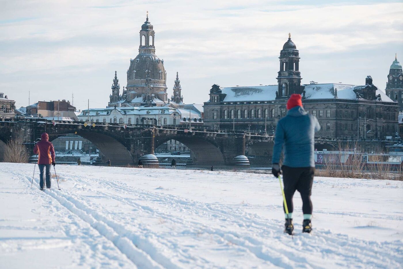 Was für eine Traumkulisse für Skifahrer! Reichlich Neuschnee hat auch die Elbwiesen vor Dresdens historischer Altstadt weiß gefärbt.