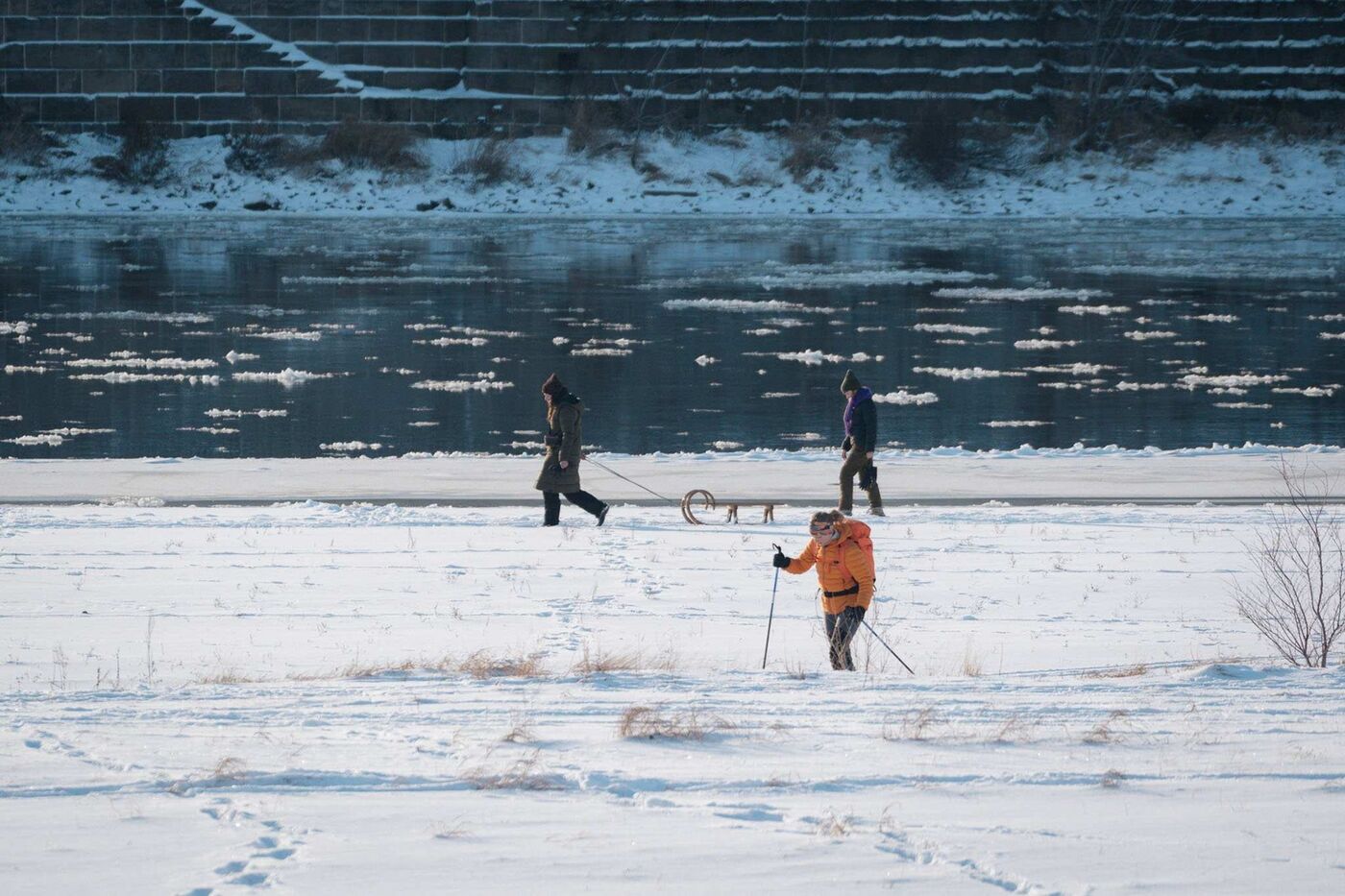Nicht nur zahlreiche Schlittenfans genießen den Sonnenschein an den Elbwiesen - auch dutzende Langlaufski-Läufer ziehen ihre Loipen vor Frauenkirche, Semperoper und Hofkirche.