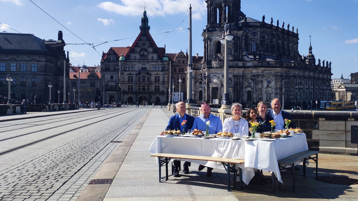 Zum sechsten Mal speisen die Dresdner heute für mehr Weltoffenheit. Erstmals wird auf der Augustusbrücke eine 340 Meter lange Tafel aufgebaut. Zwischen 16 und 20 Uhr kann jeder kommen und sich für Gespräche zu mehr Toleranz einfinden. Aber auch Musik oder Tanz wird geboten.