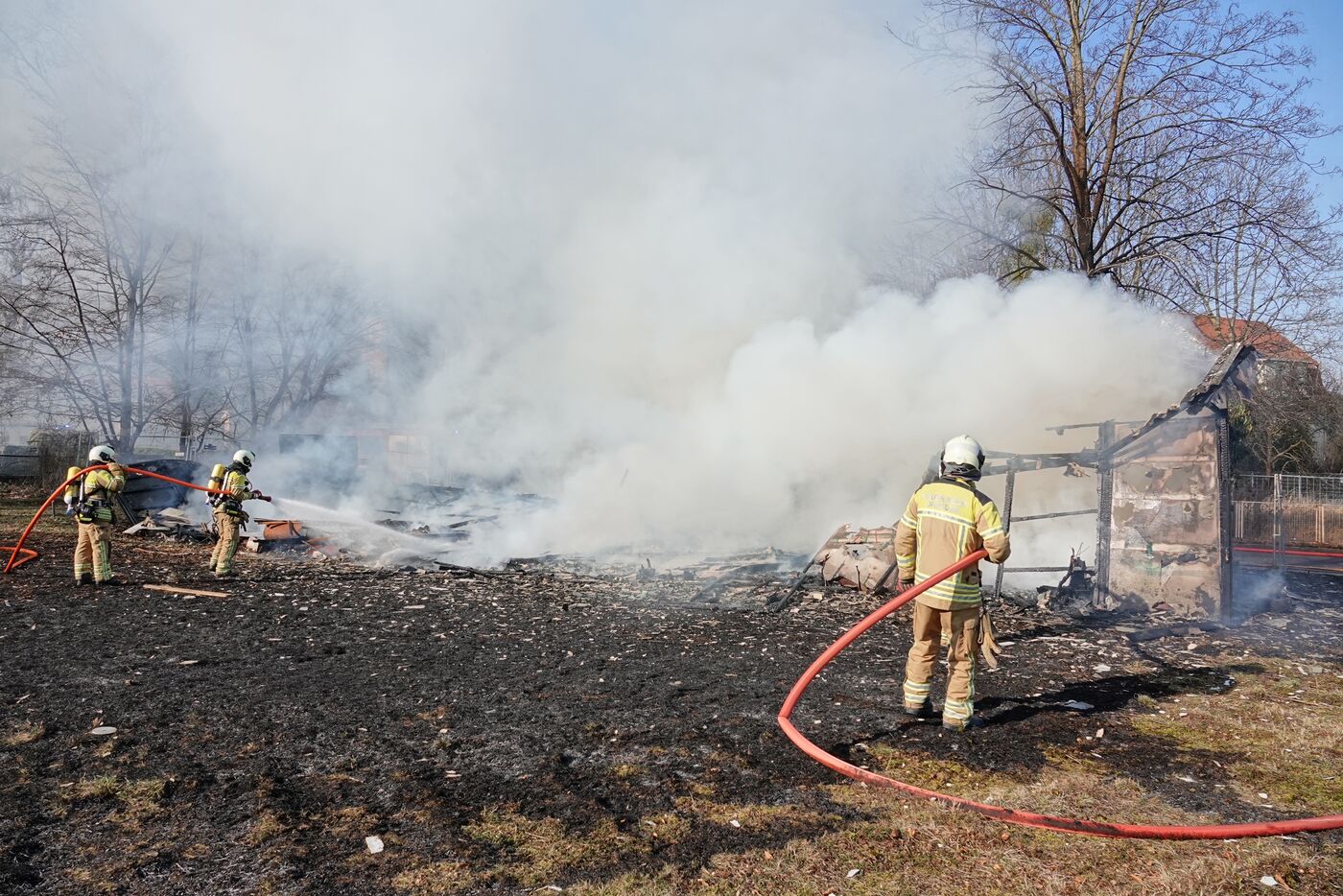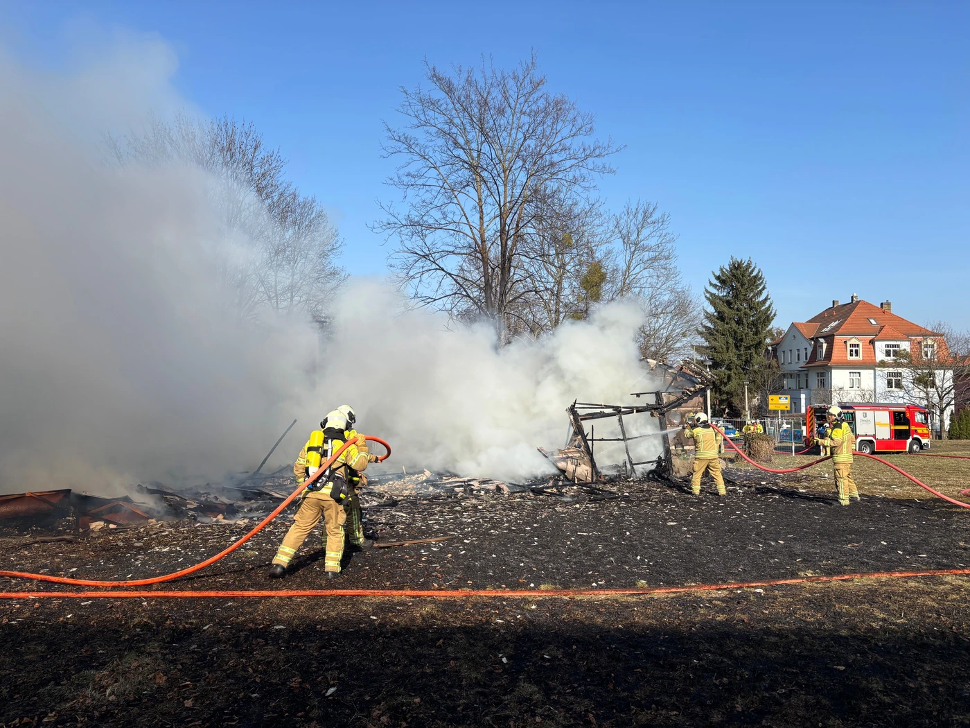 Wie uns Feuerwehrsprecher Michael Klahre gesagt hat, wurde der Brand mit vier Strahlrohren bekämpft. Derzeit dauern umfangreiche Restlöscharbeiten an. Hierfür muss das Brandgut aufwendig auseinandergezogen und nach verbliebenen Glutnestern abgesucht werden.