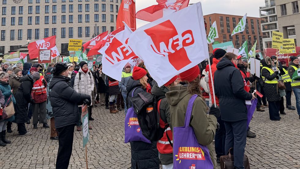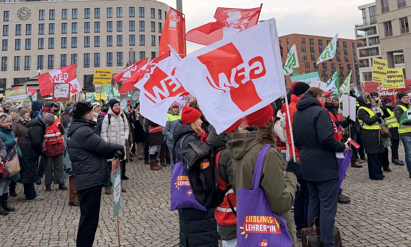 Statt im Klassenzimmer waren am Freitag rund 700 Lehrerinnen und Lehrer aus Dresden auf dem Postplatz, um für mehr Geld zu streiken. Vor der dritten Tarifrunde wollten die Gewerkschaften damit den Druck auf die Arbeitgeberseite erhöhen. Es geht um sieben Prozent mehr Lohn, mindestens aber um 300 Euro monatlich.