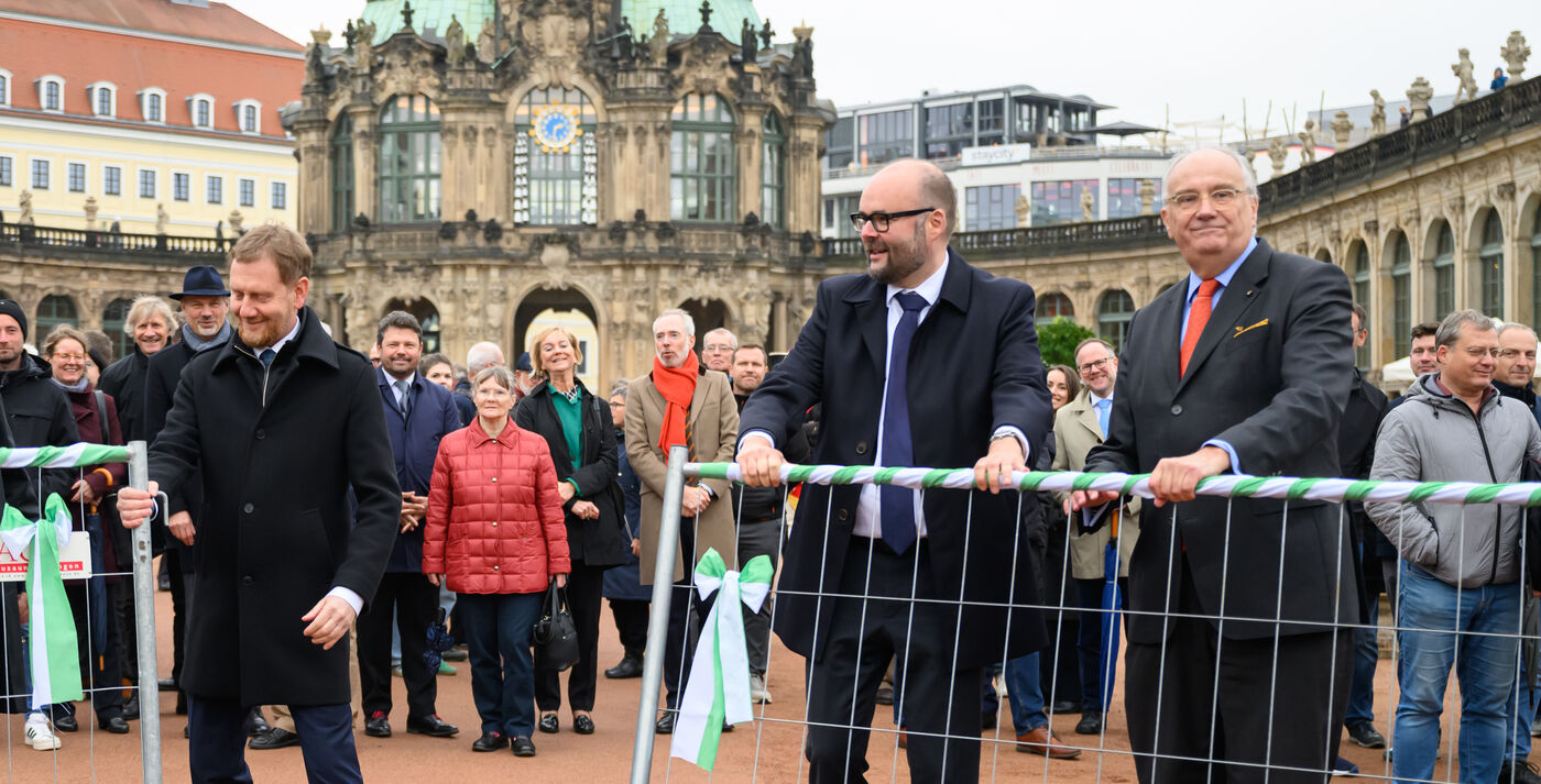 - Ministerpräsident Kretschmer, Finanzminister Piwarz und Sachsens Schlösser-Chef Striefler (v.l.n.r.) öffneten am Dienstag den letzten Bauzaun