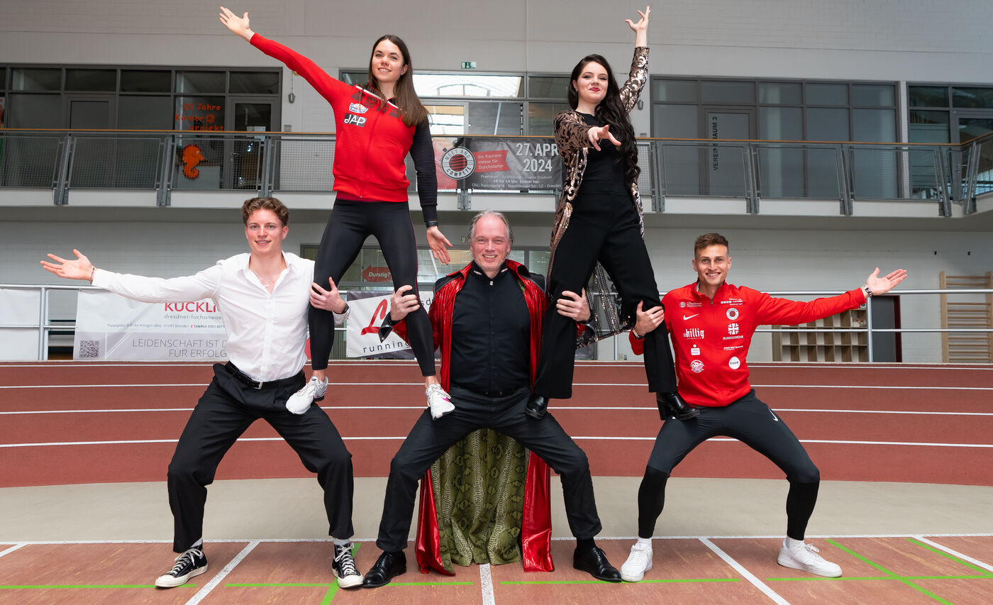 - André Sarrasani und seine Tochter Satin mit dem deutschen Hindernis-Meister Karl Bebendorf (rechts), Sprinter Ivo Ziebold (links) und 400m-Läuferin Emilia Grahle (links oben) vom DSC.