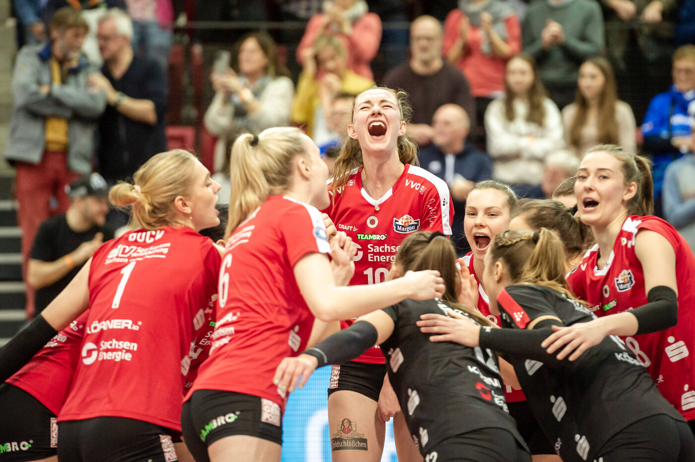 Die Dresdnerinnen, die weiter auf Stammzuspielerin Sarah Straube (Kreuzbandriss) verzichten müssen, starteten sehr konzentriert. Sie lieferten sich von Beginn an einen engen Schlagabtausch mit den Hessinnen, die in der Hauptrunde Platz vier erreicht hatten. In allen drei Sätzen erzeugte der DSC viel Druck mit den Aufschlägen, konnte aus stabiler Annahme sehr variabel angreifen. Besonders in den engen Schlussphasen hatten die Elbestädterinnen deutliche Vorteile in der Blockabwehr, leisteten sich weniger Fehler und fanden auch immer wieder gute Lösungen im Angriff. Nach 101 Minuten verwandelte Agnes Pallag, die auch zur MVP gewählt wurde, den zweiten Matchball zum Sieg (mit dpa).