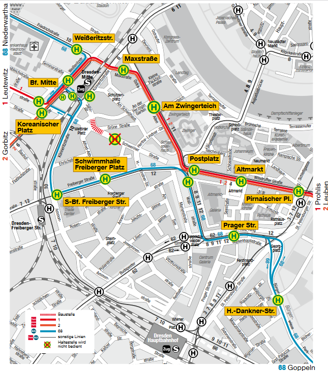 Von Montag, dem 14. Februar, 4:00 Uhr bis Montag, 28. Februar, 4:00 Uhr müssen daher die Straßenbahnlinien 1 und 2 zwischen Postplatz und Bahnhof Mitte über Ostra-Allee, Maxstraße und Weißeritzstraße umgeleitet werden. Die Buslinie 68 fahren ab Postplatz über Freiberger Straße, Ammonstraße, Könneritzstraße und Weißeritzstraße.
