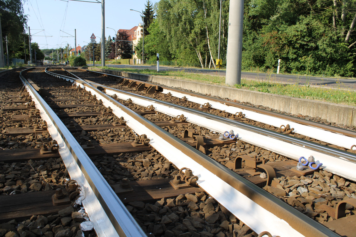 Das Verkehrsunternehmen testet deshalb an zwei Standorten eine weiße Beschichtung. Für den Anstrich wird lösungsmittelfreie Fassadenfarbe verwendet. Die Kosten betragen rund 500 Euro, gestrichen haben die DVB-Gleisbauer selbst. Im Laufe des Sommers finden mehrere Messreihen statt. Dafür wird ein magnetisches “Schienenthermometer„ angebracht, auf dem man die Erwärmung ablesen und mit dem nicht gestrichenen Gleis direkt vor Ort vergleichen kann.