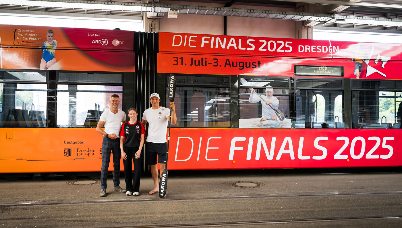 Eine bunt beklebte Bahn der DVB rührt ab sofort die Werbetrommel für die Finals. Am 31. Juli startet das Multisportevent in Dresden, bei dem Deutsche Meisterschaften in verschiedenen Disziplinen, wie Leichtathletik, Basketball oder Klettern, gleichzeitig ausgetragen werden. Mit dabei ist auch der Dresdner Kanute Tom Liebscher Lucz.