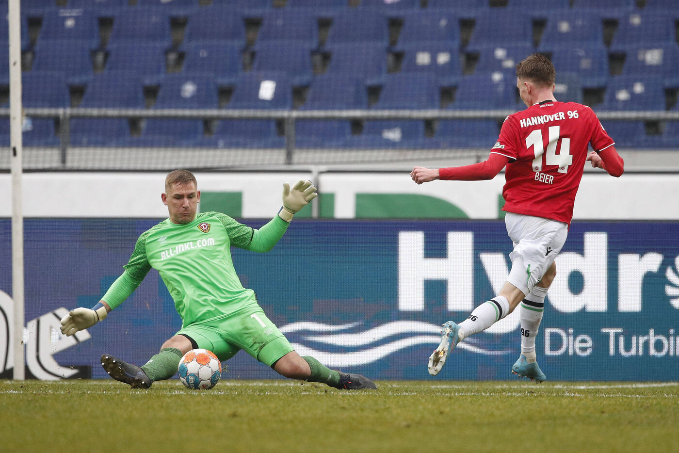 In der Anfangsviertelstunde waren beide Mannschaften um spielerische Elemente bemüht. Die Ausführung jedoch war häufig nur mangelhaft. Intensive Zweikämpfe dominierten die Partie in dieser Phase. Dynamo geriet immer wieder in Schwierigkeiten, wenn sich die Gastgeber schnell und flach durch die Schnittstellen in der Dresdner Abwehr kombinierten. So zum Beispiel beim Vorstoß von Linton Maina (21.). Der Hannoveraner tankte sich über die rechten Abwehrseite durch und prüfte SGD-Keeper Broll auf Nahdistanz. Dieser tauchte blitzschnell ab und parierte mit dem Fuß. Auch den Abstauber von Sebastian Kerk konnte Broll parieren.