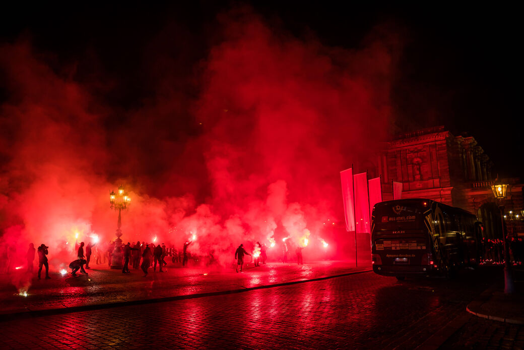 Die Dynamos sind nach ihrem Derbysieg in Aue euphorisch empfangen worden. Für die Mannschaft gab es auf dem Theaterplatz vor der Semperoper eine Pyroshow.