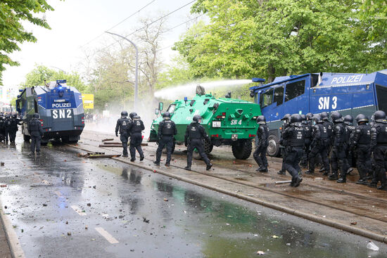 Update zu #1605: Die Lage ist noch immer dynamisch. Es gibt immer wieder Angriffe auf unsere Einsatzkräfte, weshalb unmittelbarer Zwang und Reizstoffe eingesetzt werden mussten. Der Wasserwerfer kam kurzzeitig zum Einsatz.