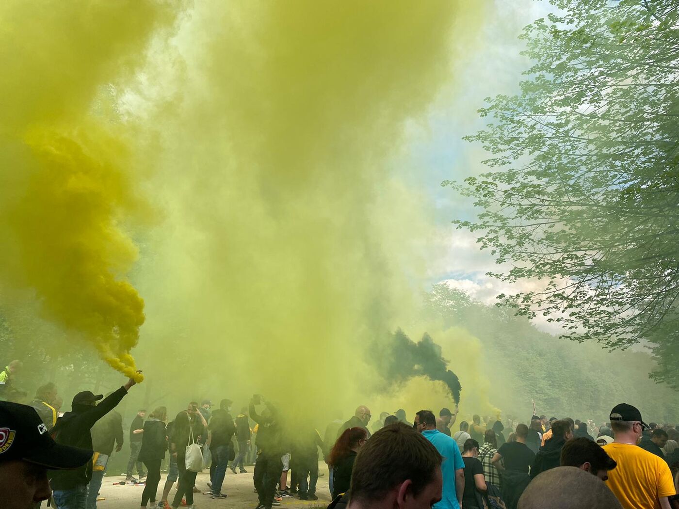 Obwohl der Verein im Vorfeld genau wie Dresdens Oberbürgermeister Dirk Hilbert (FDP) an die Anhänger appellierten, nicht zum Stadion zu kommen und zu Hause zu bleiben, versammelten sich noch vor dem Anpfiff hunderte von Fans um die Spielstätte.