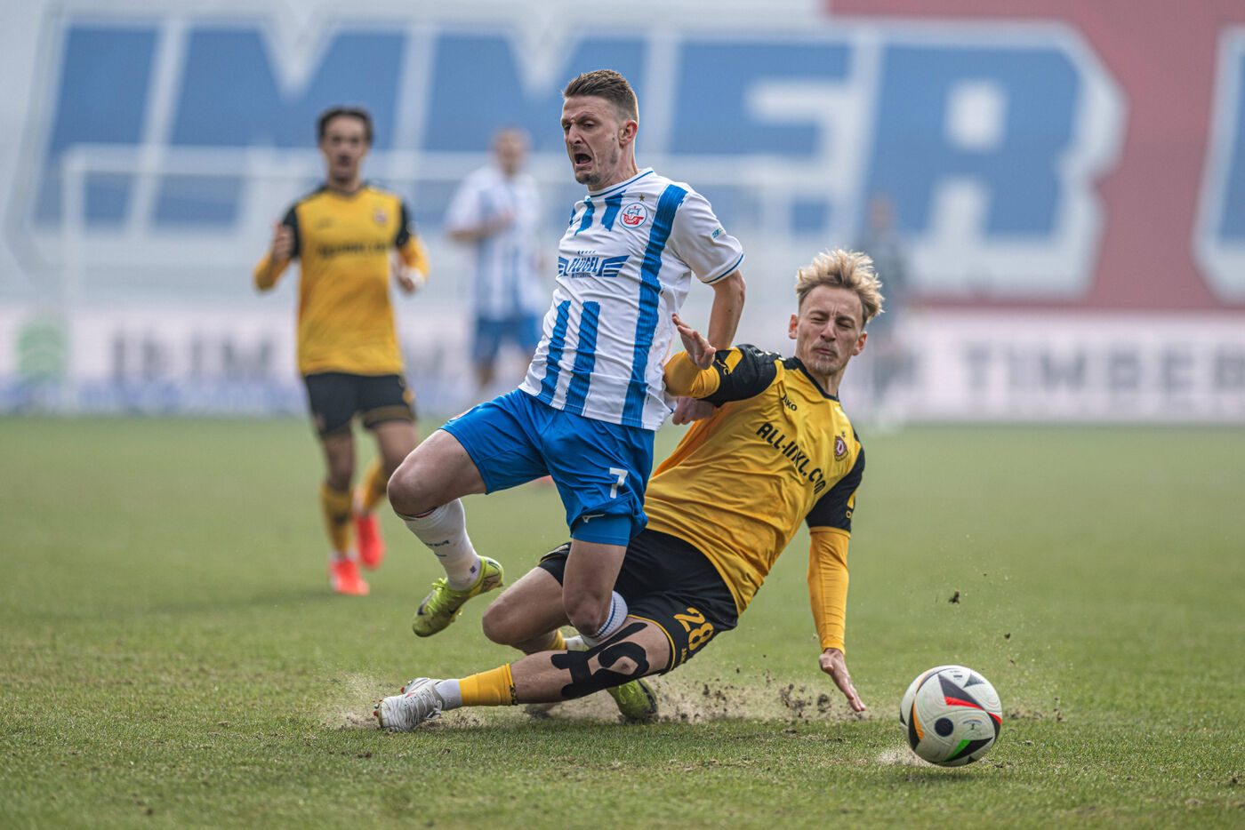 Hansa begann nach dem deftigen 0:5 in Mannheim schwungvoll. 20 Minuten ließen die Gastgeber dem Tabellenzweiten kaum Zeit zum Luftholen, pressten hoch und liefen jedem Ball nach. Dynamo fand zunächst keine Zuordnung, was beim Gegentor sichtbar wurde. Fröling konnte eine ins Zentrum geschlagene lange Flanke ungehindert zwischen zwei Dresdner Abwehrspielern zur Führung köpfen.