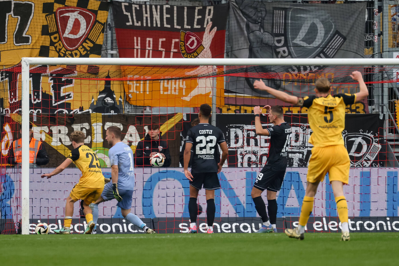 Dresdens Trainer Thomas Stamm war in der zweiten englischen Woche in Serie zur Rotation gezwungen. Mit Kapitän Stefan Kutschke (Rotsperre) und Niklas Hauptmann (Gelb-Sperre) fehlten zwei Führungsspieler. Tony Menzel erhielt eine Verschnaufpause, stand ebenfalls nicht im Aufgebot. Für das Trio liefen Oliver Batista Meier, Jakob Lemmer und der spätere Torschütze Oehmichen auf. Der Personalwechsel machte sich kaum bemerkbar. Die Dresdner spielten engagiert und hielten die zweitbeste Offensive der Liga im ersten Abschnitt weitestgehend in Schach. Erst der direkte Besuschkow-Freistoß kurz vor der Halbzeit brachte die Gastgeber in Front.
