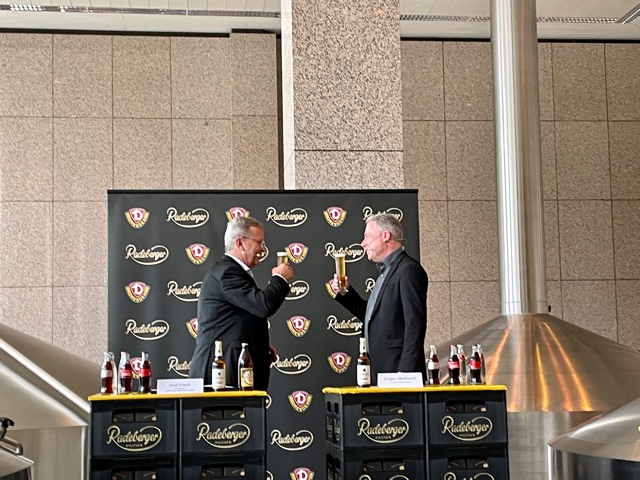- Radeberger-Chef Axel Frech und Dynamos Geschäftsführer Jürgen Wehlend stoßen auf die gemeinsame Zukunft an