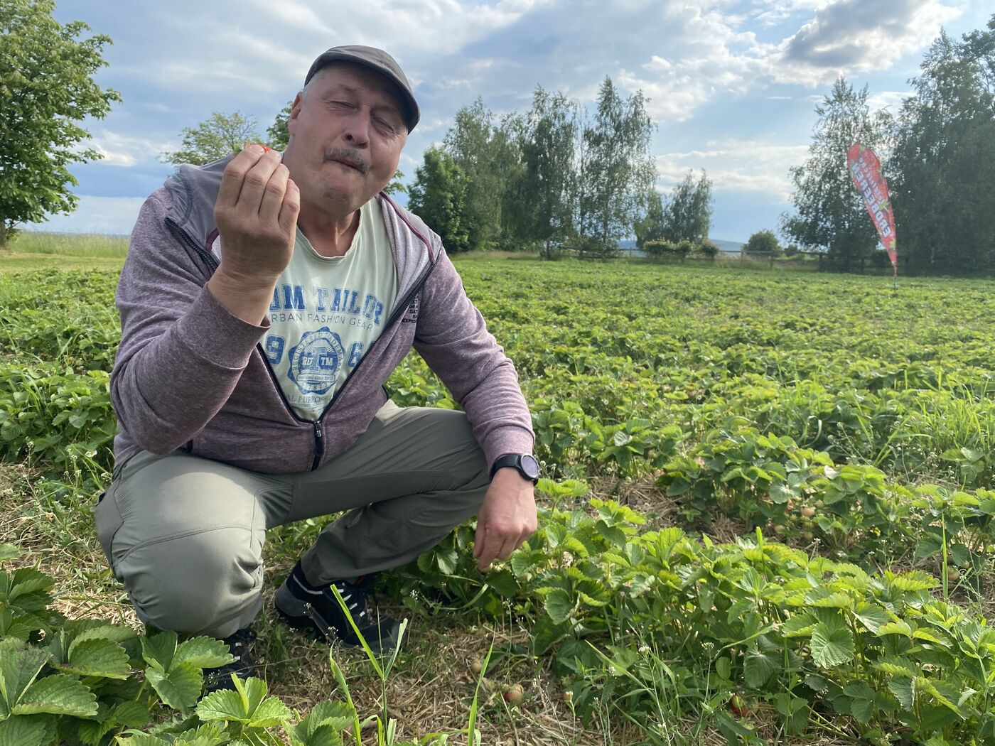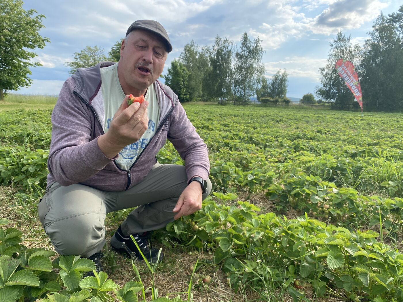 - Heiko Hübler, Chef der Obstgut Genossenschaft Seelitz in Mittelsachsen, probiert eine Erdbeere auf einem seiner drei Felder bei Rochlitz ...