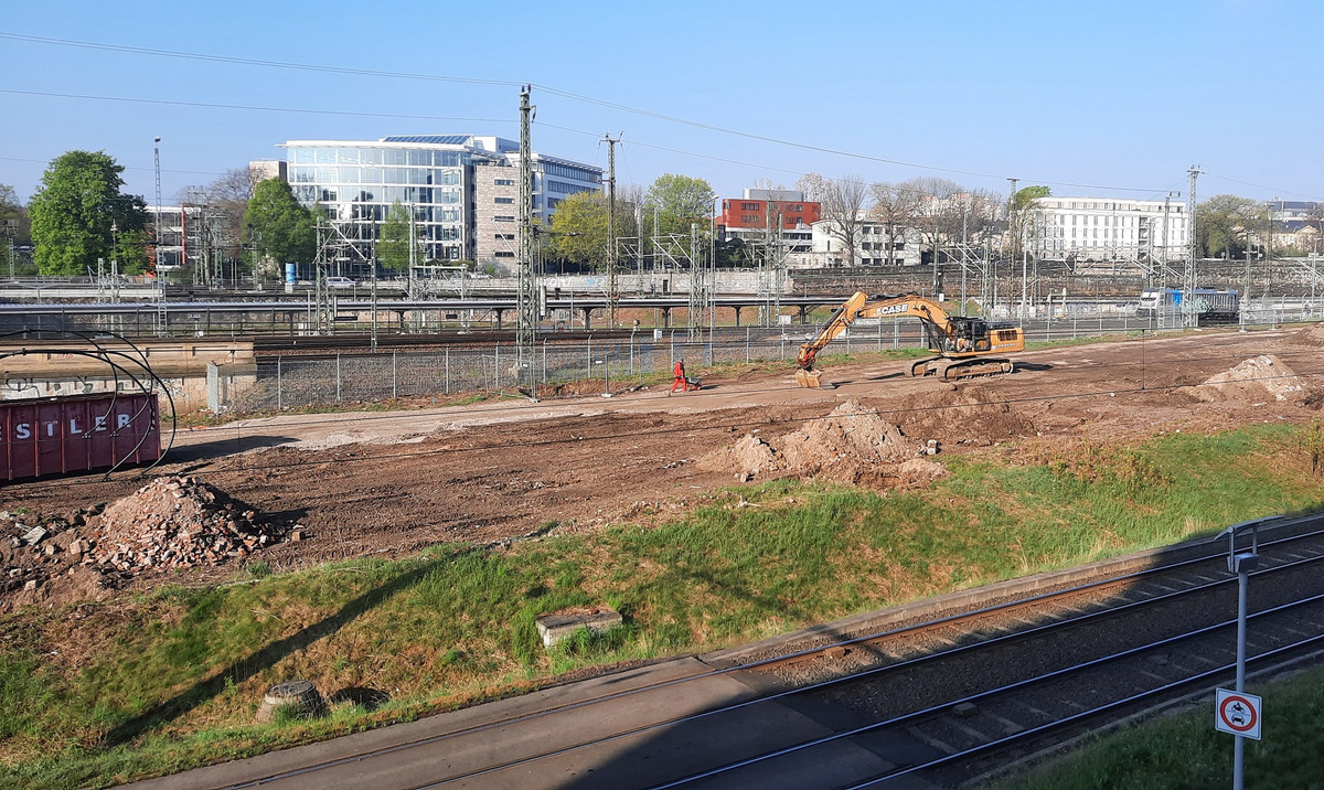Am Wiener Platz in Dresden haben die ersten Vorbereitungen für den Bau des Fernbusterminals begonnen. Auf dem Gelände drehen sich auch schon die ersten Bagger.
