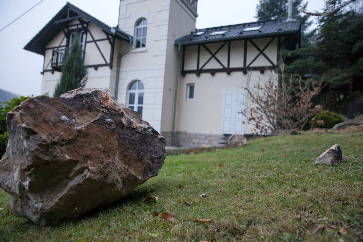 Mehrere Brocken trafen bei einem Felssturz die "Villa Maria" in der Stadt Wehlen. Eine Tür auf der Rückseite des Gebäudes wurde zetrümmert. Am Montagnachmittag rückte die Feuerwehr an, und sperrten den Bereich rund um die Villa. Fachleute des Nationalparks untersuchten den Steinschlag. Offenbar hatten die Wurzeln zweier Kiefern das Gestein gesprengt. Dazu kam starker Wind, der die Bäume hin und her bewegte und so den Felssturz ausgelöst haben könnte. Am Dienstagvormittag sollen Fachleute vom Landesamt für Geologie aus Freiberg die genaue Ursache untersuchen. Verletzt wurde niemand.