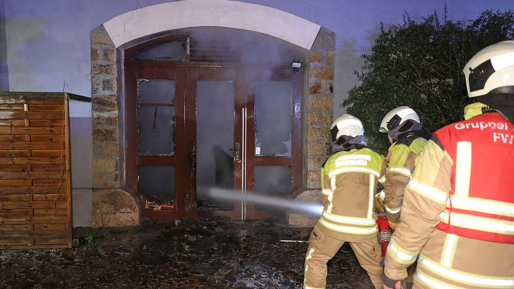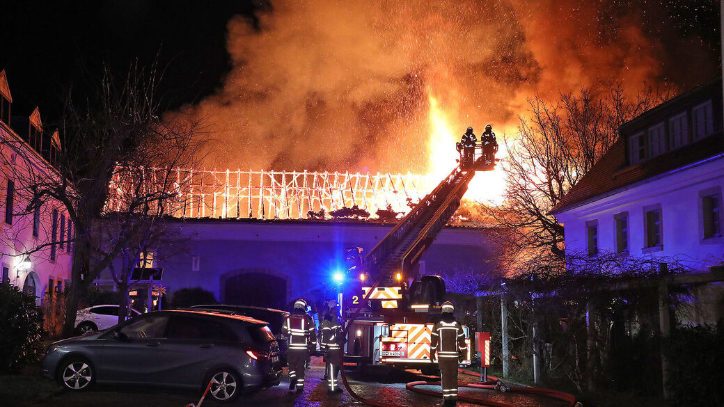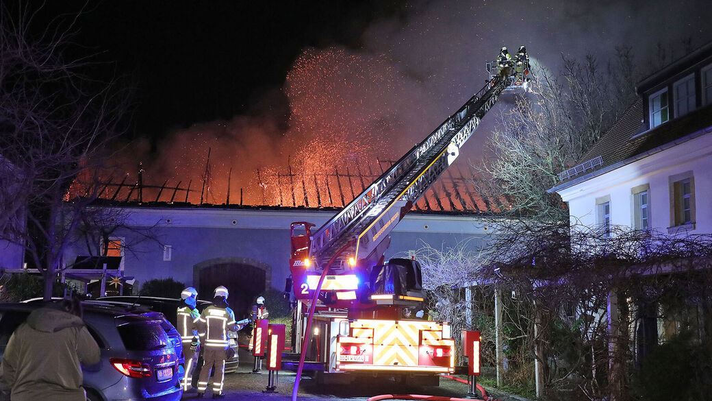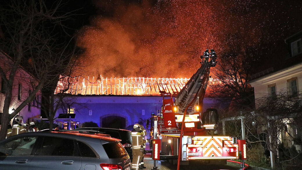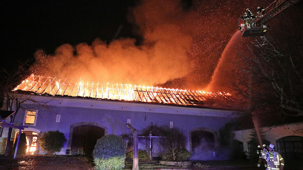 - Mit mehreren Strahlrohren und einem Großaufgebot ist die Feuerwehr im Löscheinsatz